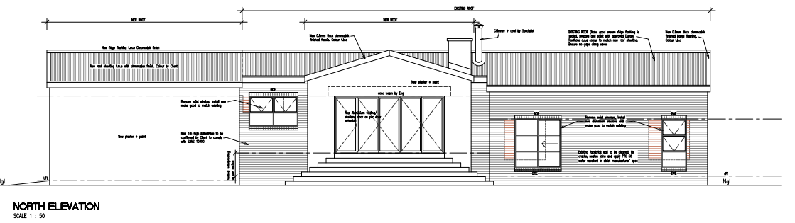 brickwork and light grey plaster walls for white areas charcoal roof sheeting late afternoon some internal lights