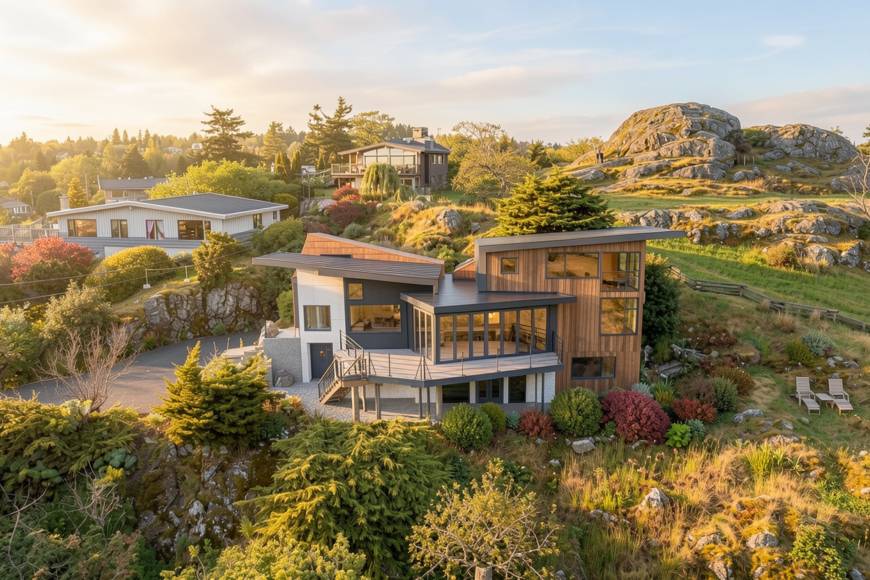 render a picturesque chalet style cabin nestled in a pinewood forest landscape the cabin features rustic wooden beams with a natural brown finish set atop a foundation of elegant gray stone large windows reflect the soft glow of the interior light surrounding the cabin are lush pine trees in rich shades of green the rocky terrain around the cabin includes detailed textures of gray stone alongside vibrant greenery and wildflowers in the background majestic mountains with snowy peaks rise into a sky filled with dramatic clouds painted in hues of soft blue and gray the atmosphere is serene and inviting capturing the tranquil beauty of a remote mountain retreat