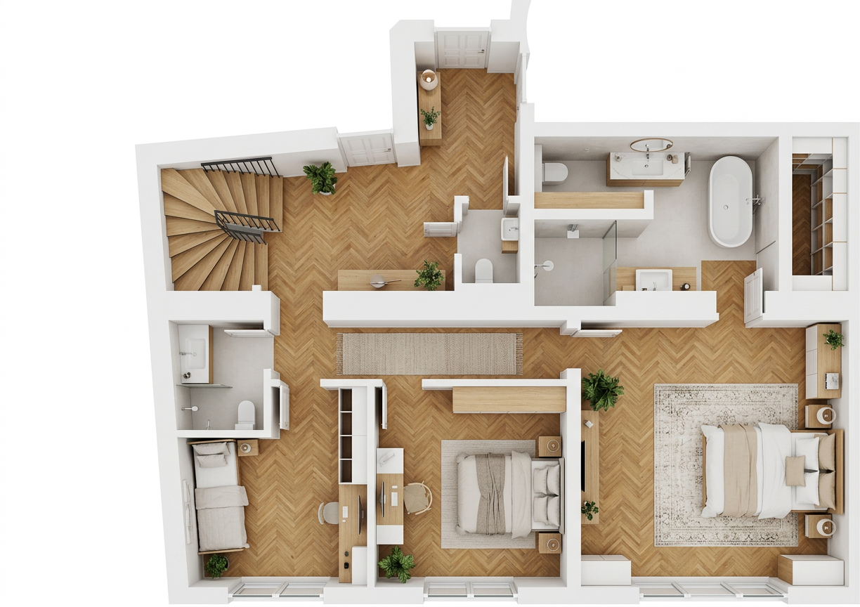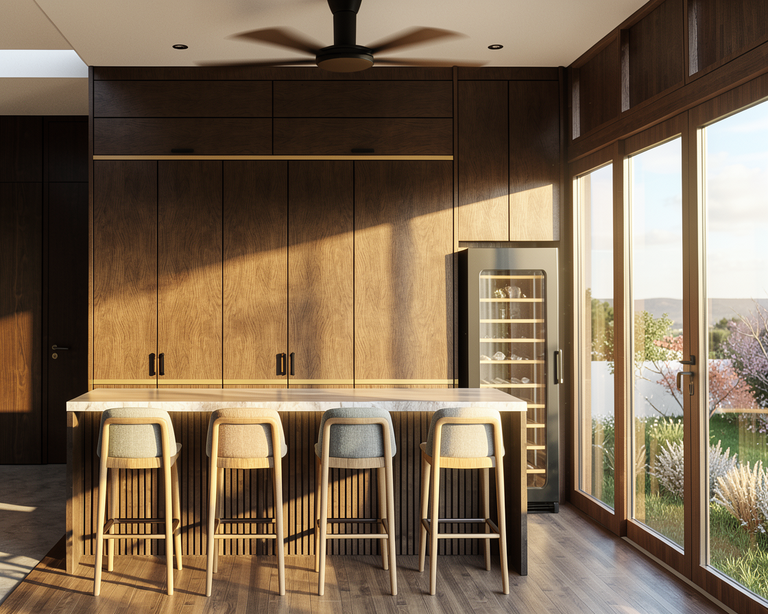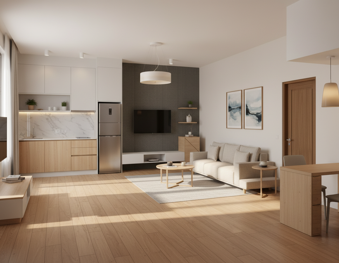 exterior shot apply the mood board into the interior with luxury modern style remove the pendant lamps