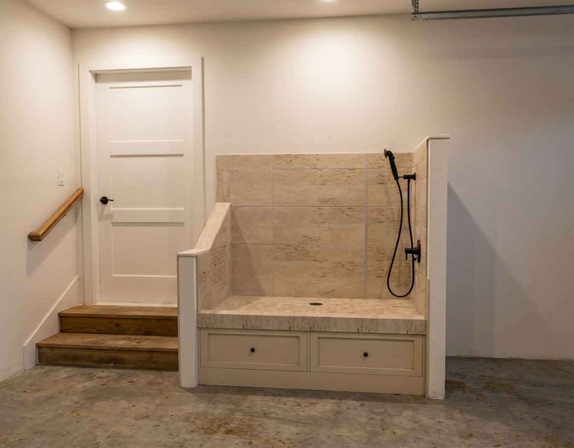 greenhouse with brick wall filled with light and lush with small potted citrus trees and plants the space is divided for both living and plants add a small potting station against the wall outside is a back yard with blue skies and manicured grass lawn