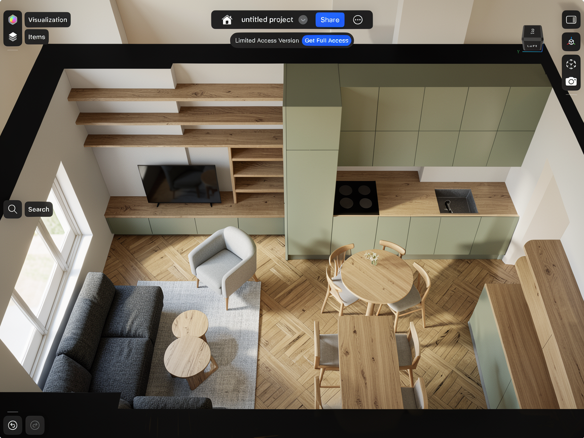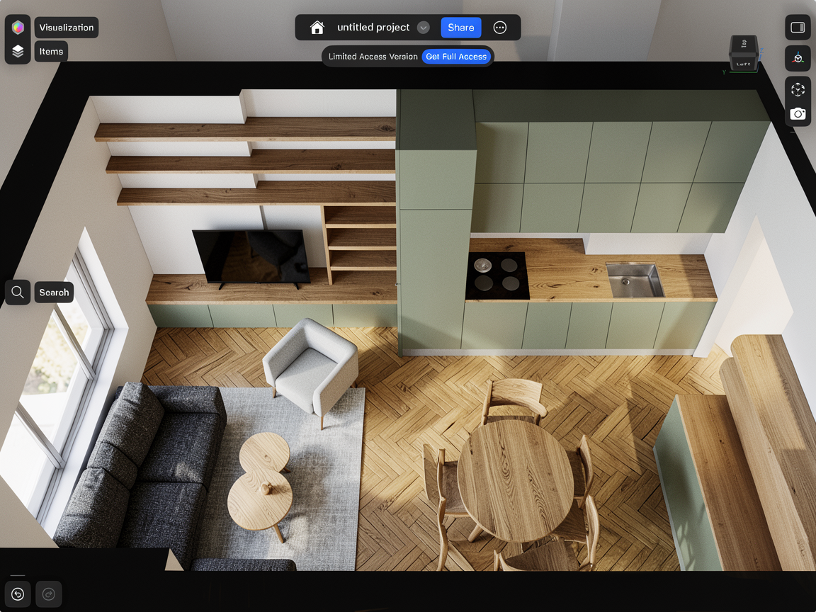 use the provided 3d render strictly as the base image important keep the exact same camera angle perspective composition room geometry walls windows kitchen layout and furniture positions do not change the viewpoint and do not redesign the room do not add new furniture in different locations only modify materials and replace specific objects while keeping their original position dining area replace the existing rectangular dining table with a round wooden dining table in the exact same position keep the table centered in the same dining area location place four chairs evenly around the round table living area keep the sofa in the same position but give it a dark grey fabric upholstery with visible textile texture coffee tables keep the coffee tables in front of the sofa but make them round oak wood coffee tables with natural wood grain armchair keep the armchair in the same position and make it a light grey modern designer armchair rug add a light grey area rug under the sofa and coffee tables only kitchen kitchen cabinets should be sage green with a matte finish countertop should be natural oak wood tv wall shelves around the tv should be natural oak wood floor natural oak herringbone parquet flooring warm tone matte finish lighting and atmosphere soft natural daylight from the window warm scandinavian interior atmosphere realistic shadows photorealistic interior visualization preserve the original layout and composition of the base render