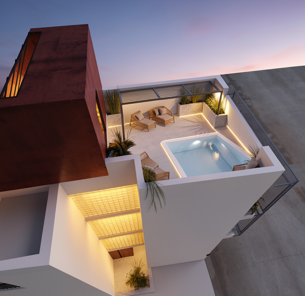 dont change anything about geometry this metallic pergola replace with a wooden pergola with linen folding pattern with the draping fabric on the sides