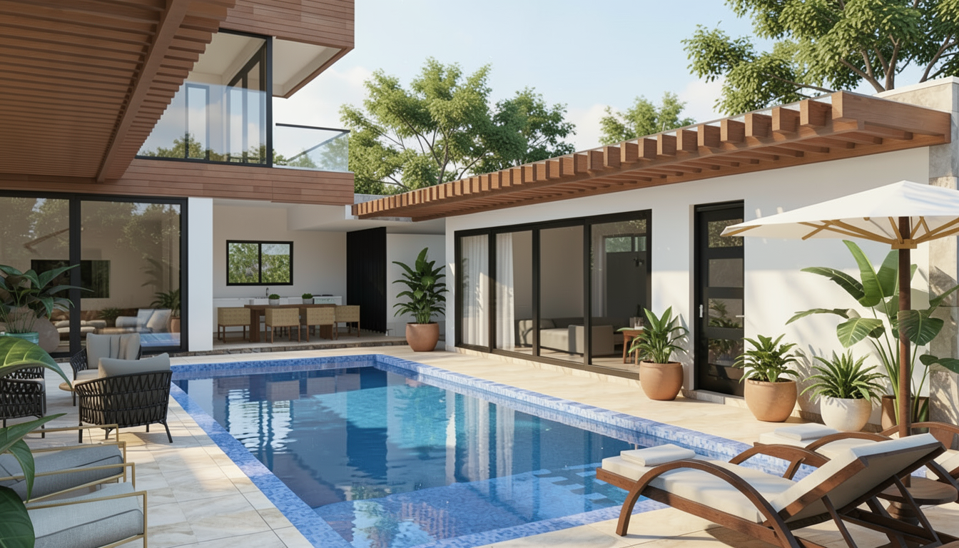 image of a house add few trees in background for context add some vegetatio n including floral ones for context add some potted plants and make scene look lived in