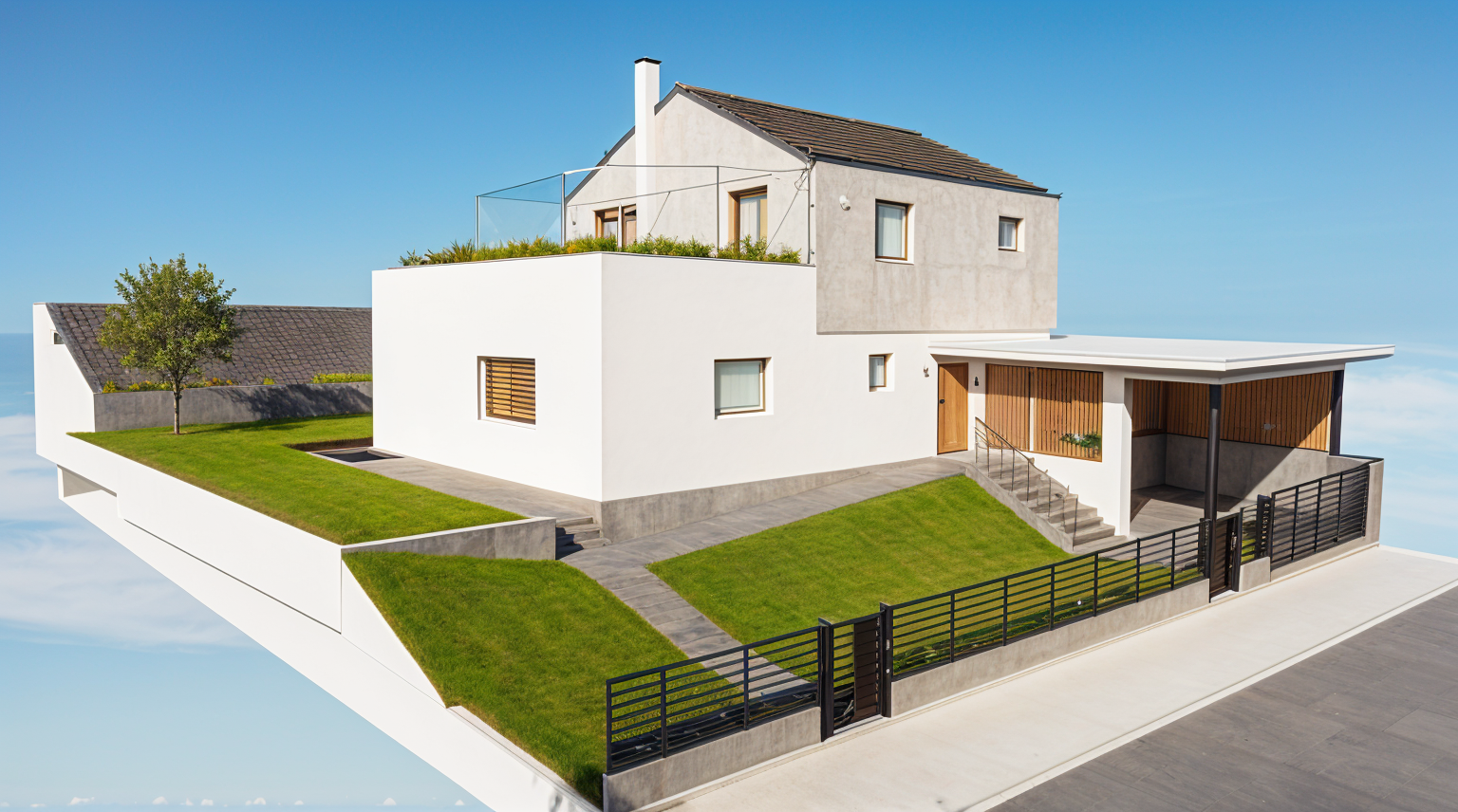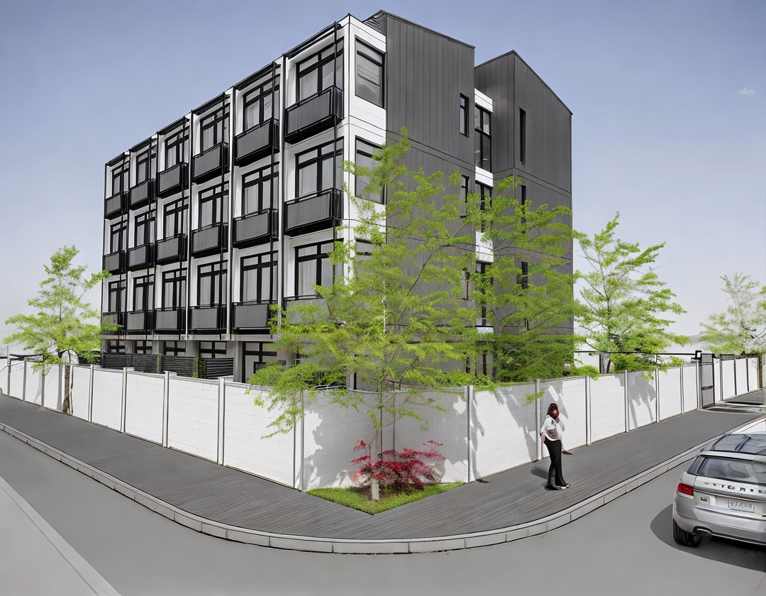 perspective shot render a early evening scene with a warm dusk and light that are on inside the apartment architecture