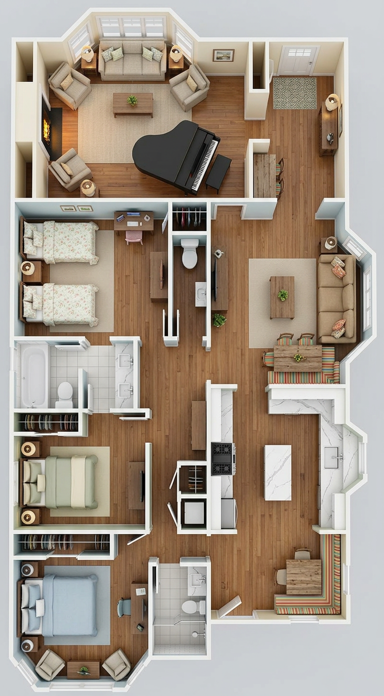 convert this floor plan into a realistic isometric 3d view of a full house show the space from an elevated angle with furniture walls and details visible cottage style single family home hardwood floors tile for bathrooms and quartz countertop for kitchen next to the kitchen is a breakfast nook with a banquette each bedroom has a closet use light colors with a cottage style use the same furniture as shows on the plan do not change the orientation of the floorplan