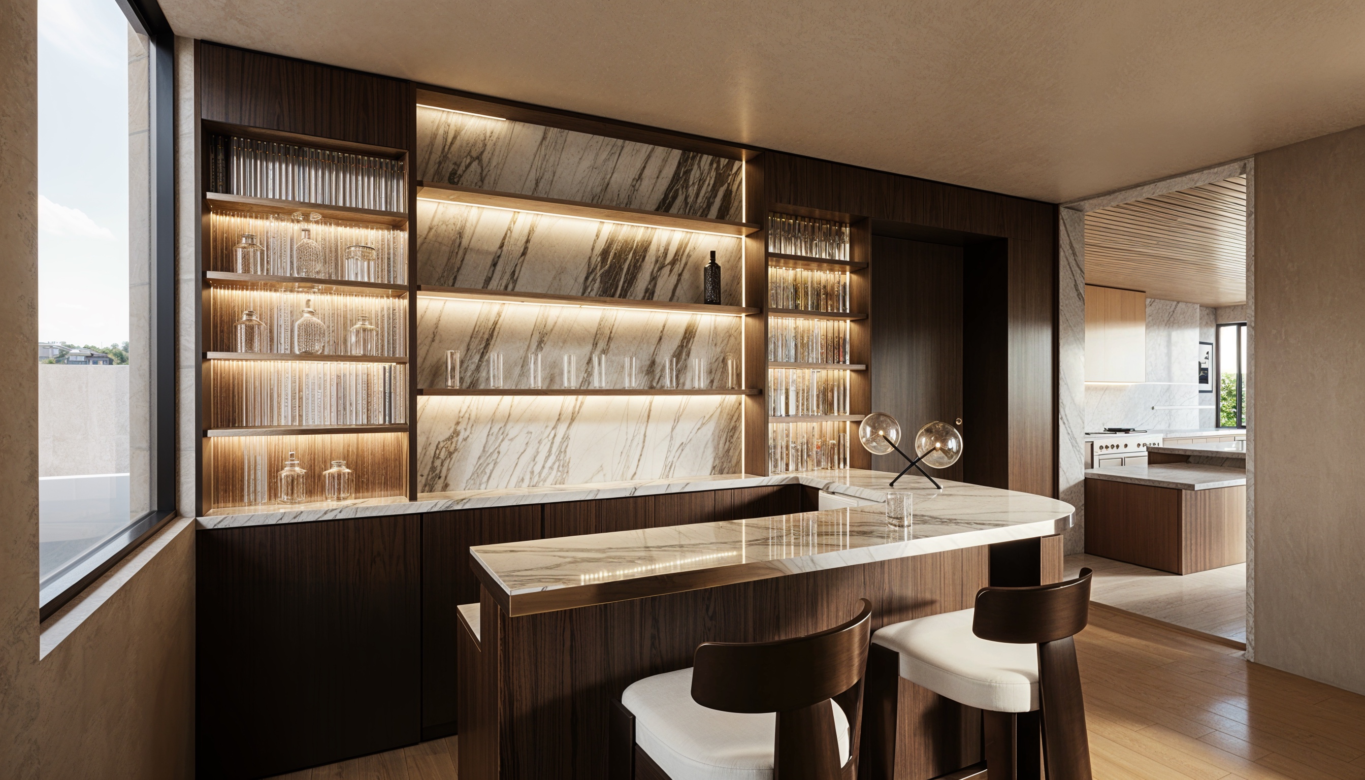 add lighting on top shelf add luxury liquor bottles on middle shelf add some luxury glassware on side shelves leave some spaces empty