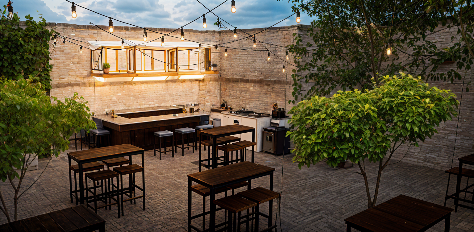 cloudy blue sky turned on hanging lights rusctic pebleed floor