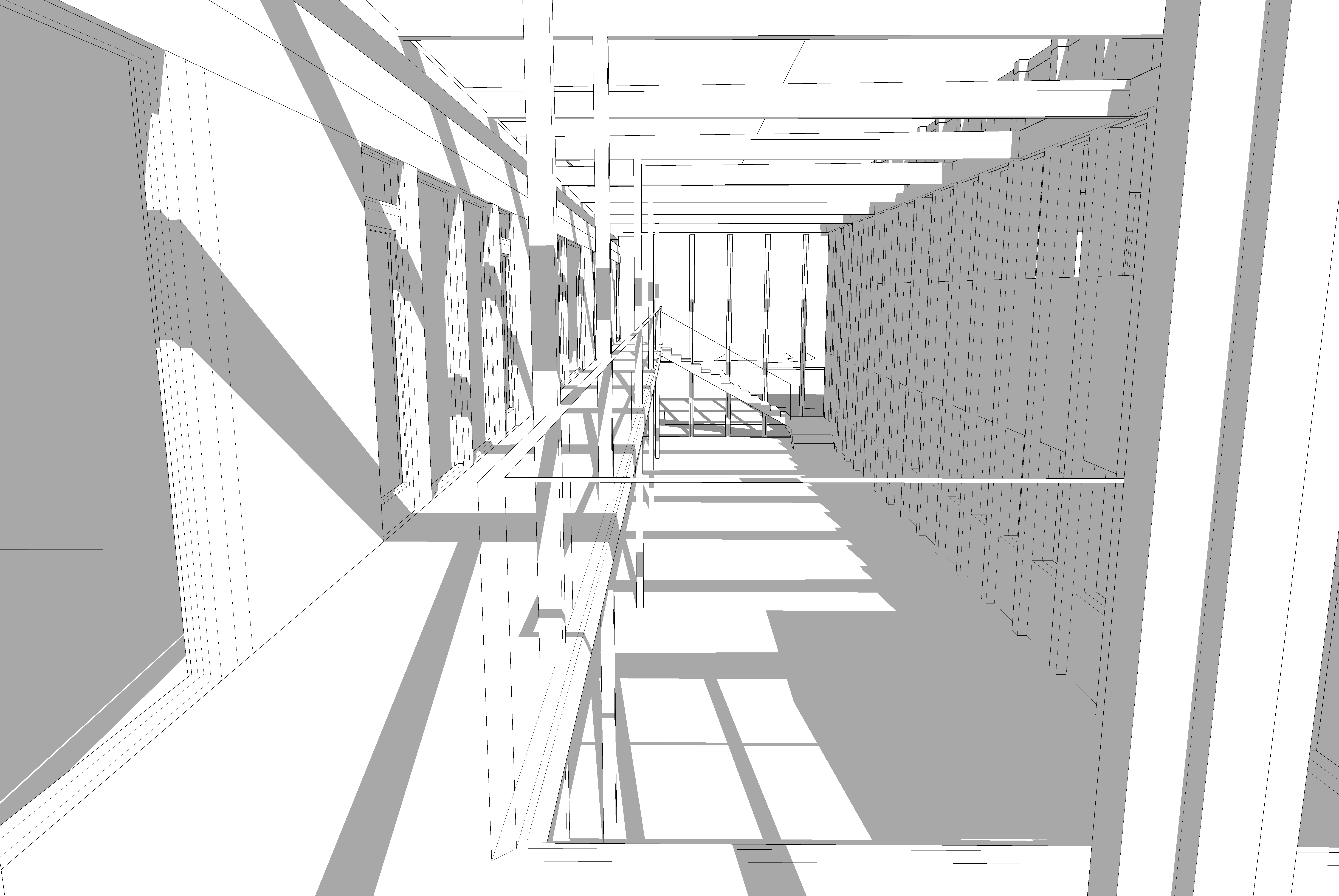 interior shot create visual showing an office atrium space with greenery clean furniture the roof is glazed the building to the right is a grey existing building the new addition is modular pod offices