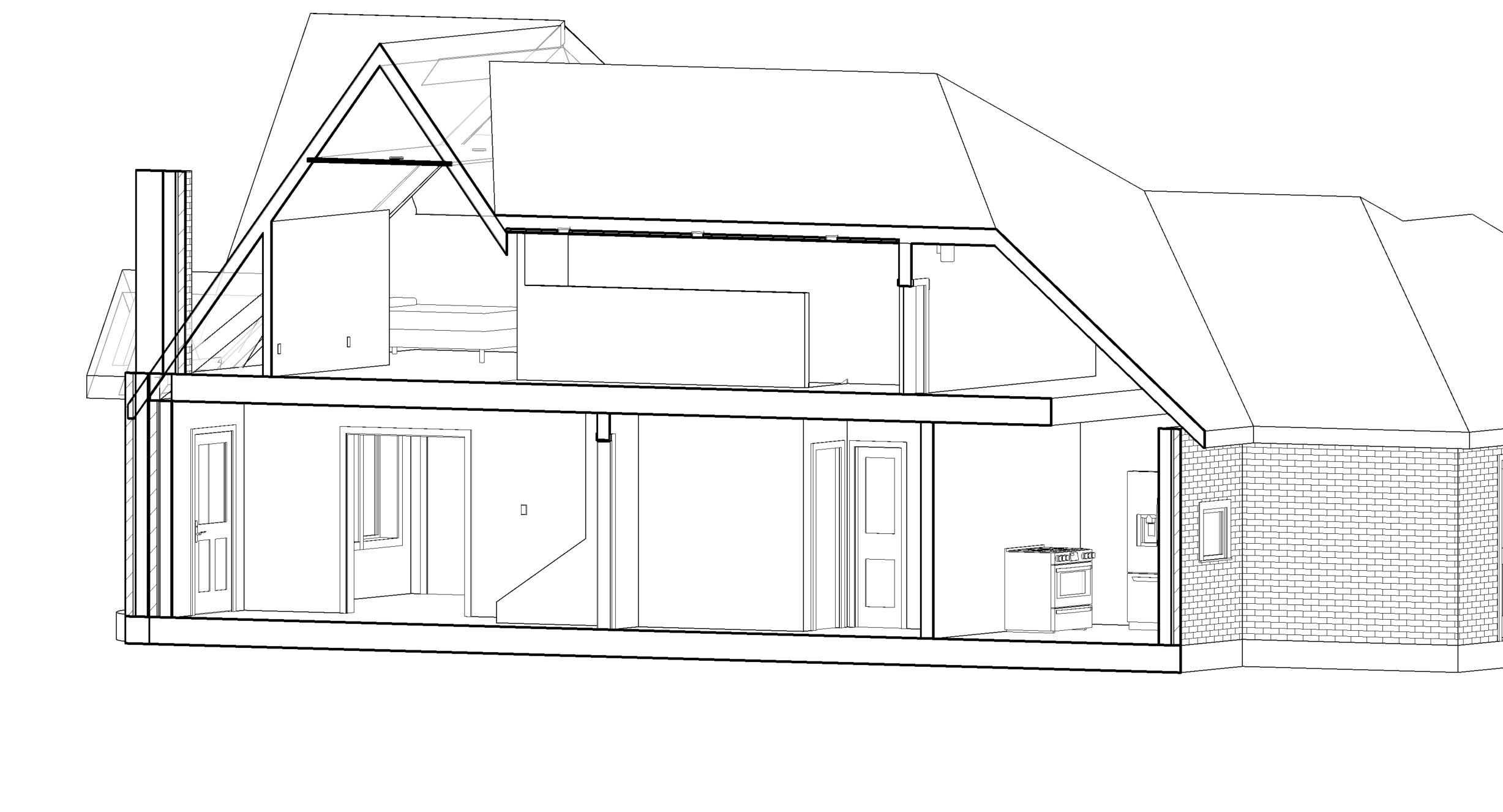 renontion to 1920 bungalow section cut through the center to show new atair up to a new bonus roo under roof