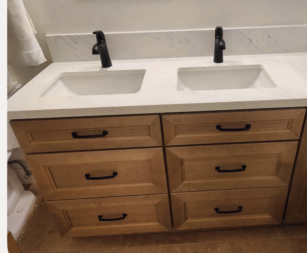 creat this 48 double sick vanity into a luxurious bathroom under a kbf home improvement logo either on the top or on the bottom