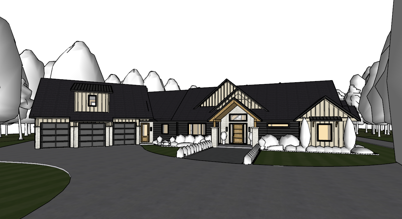 render a photorealistic 3d perspective of this house in prince george bc canada reference the current material style just enhance them vertical board batton beige siding and horizonal black hardie siding keep model geometry the same windows doors roof walls garage door pavement driveway to be light concrete make simple modern layout of vegetation that looks native to prince george bc do not change the view only enhance the current materials and make the landscape nicer vegetation detailed textures in the hardi board siding and glass reflections in garage doors panels and a vibrant clear sky with light atmospheric depth render in hyper realistic architectural visualization quality 8k resolution