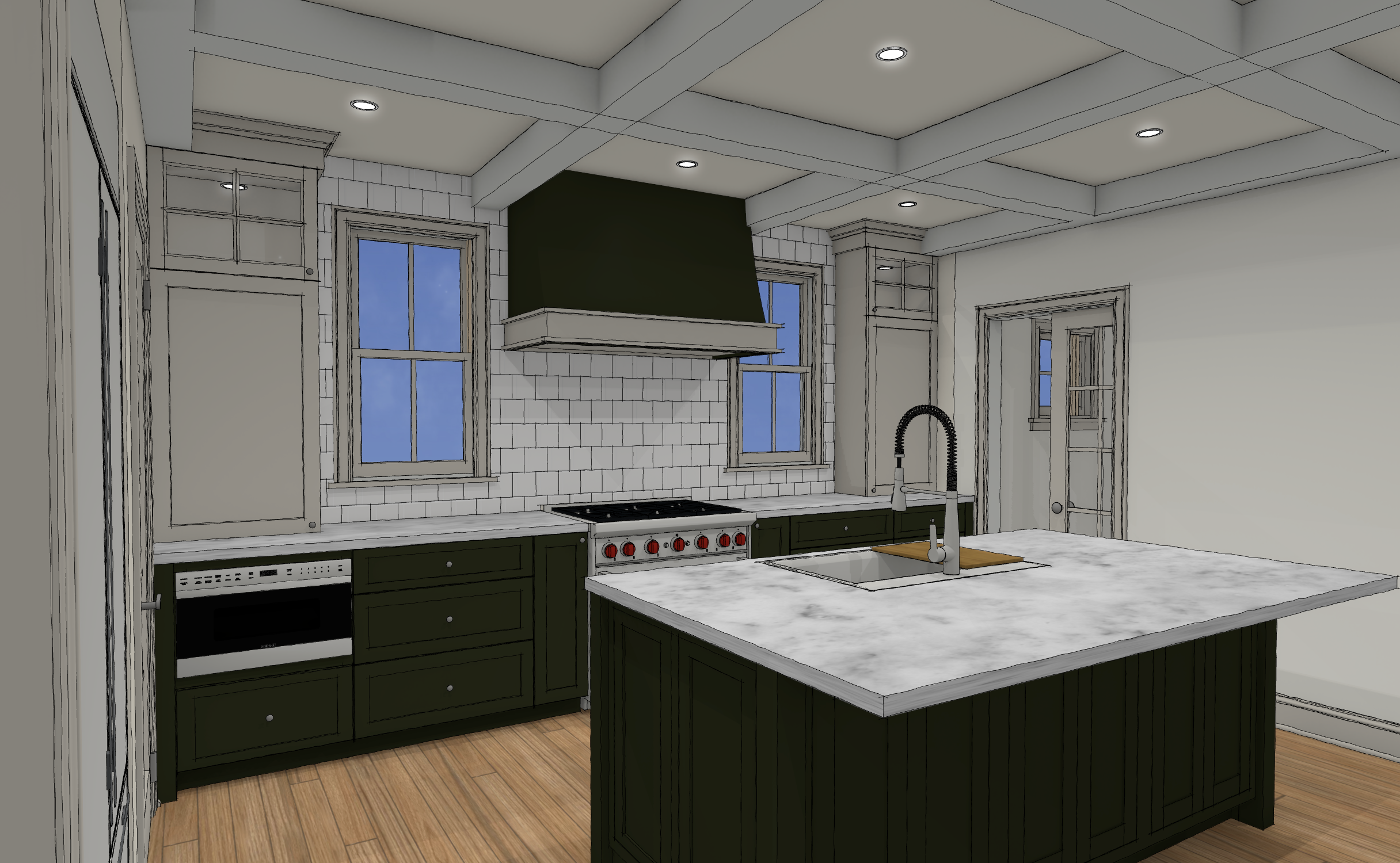 walnut uppers coffered ceiling details black base cabinets off white trim black range hood with wood mantle