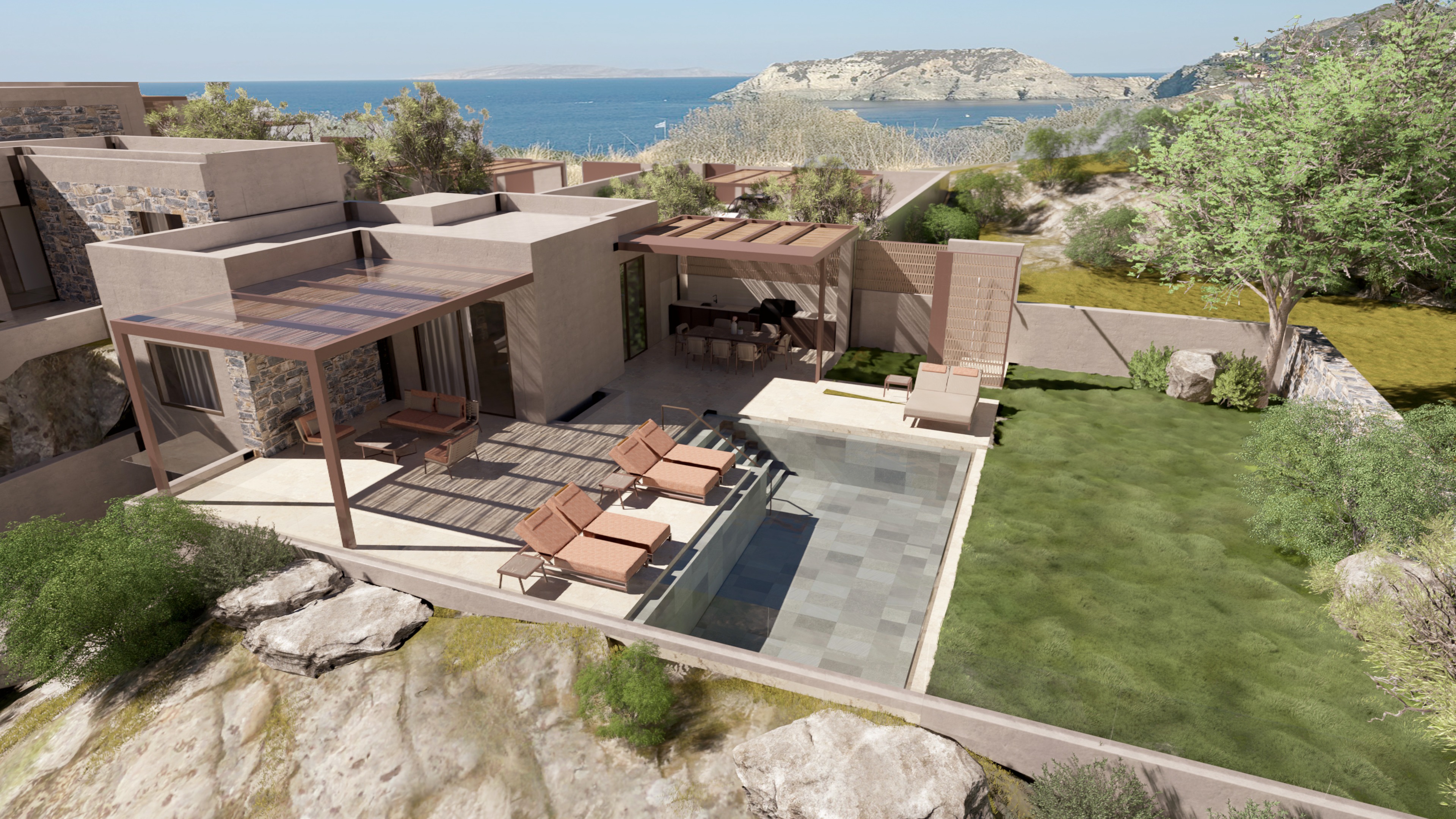 a hyper realistic image of a villa with swimming pool golden hour on the backgrounf you can see the sea and the horizon