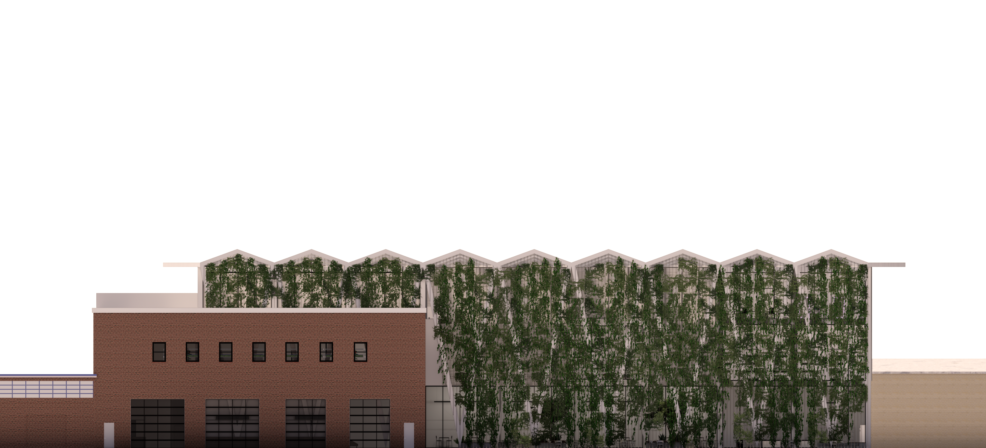 treat the starter image as a finished architectural elevation drawing do not modify reinterpret redraw or alter the geometry proportions roof forms alignment spacing mullions or fa ade composition the building shape and layout must remain 100 identical to the input no deviations no smoothing no stretching you may only enhance realism lighting fa ade texture clarity and vegetation depth apply the soft neutral atmospheric style of the reference image pale matte sky gradient subtle haze and softened shadows more realistic climbing vegetation airy layered varied density detailed stems and leaves keep mesh readable but light increase depth between plants and facade brick texture sharper but matte keep glazing neutral the architectural forms camera view and proportions are locked treat the image as a photo that cannot be changed only refined