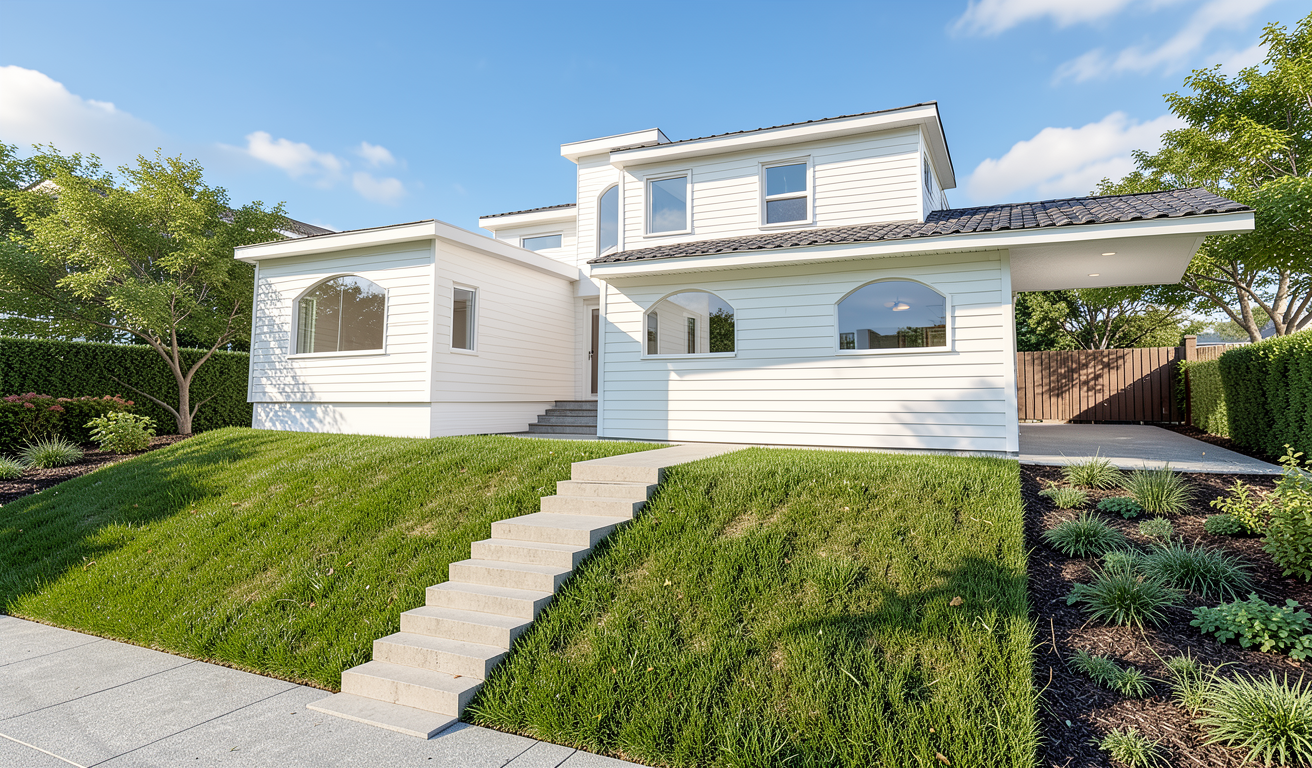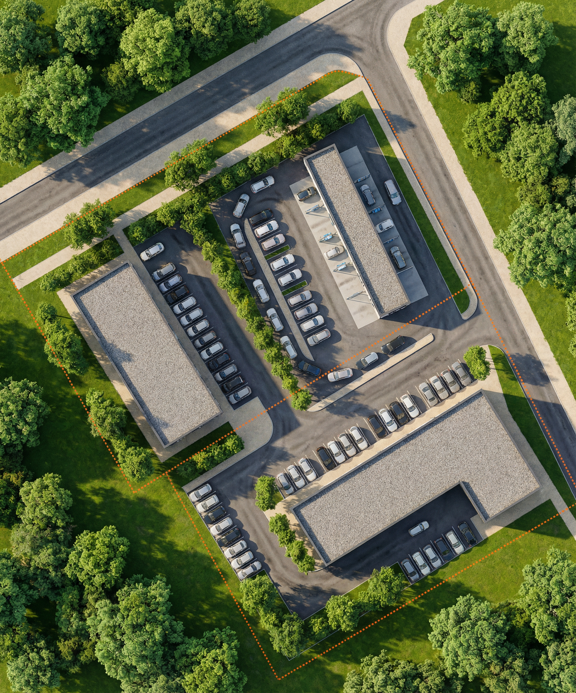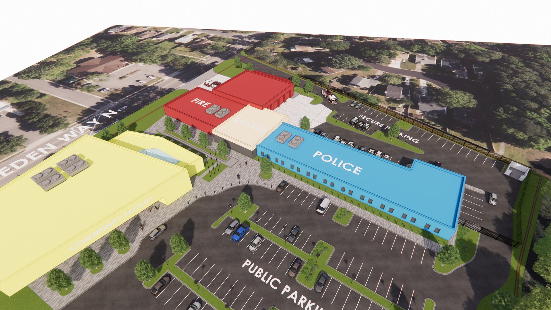 use this image to create a soft rendering of a municipal campus the yellow building is a library the other building is a joint use public safety center with the red area serving the fire department and the blue area serving the police the space between fire and police is the common entry the materials should be coastal