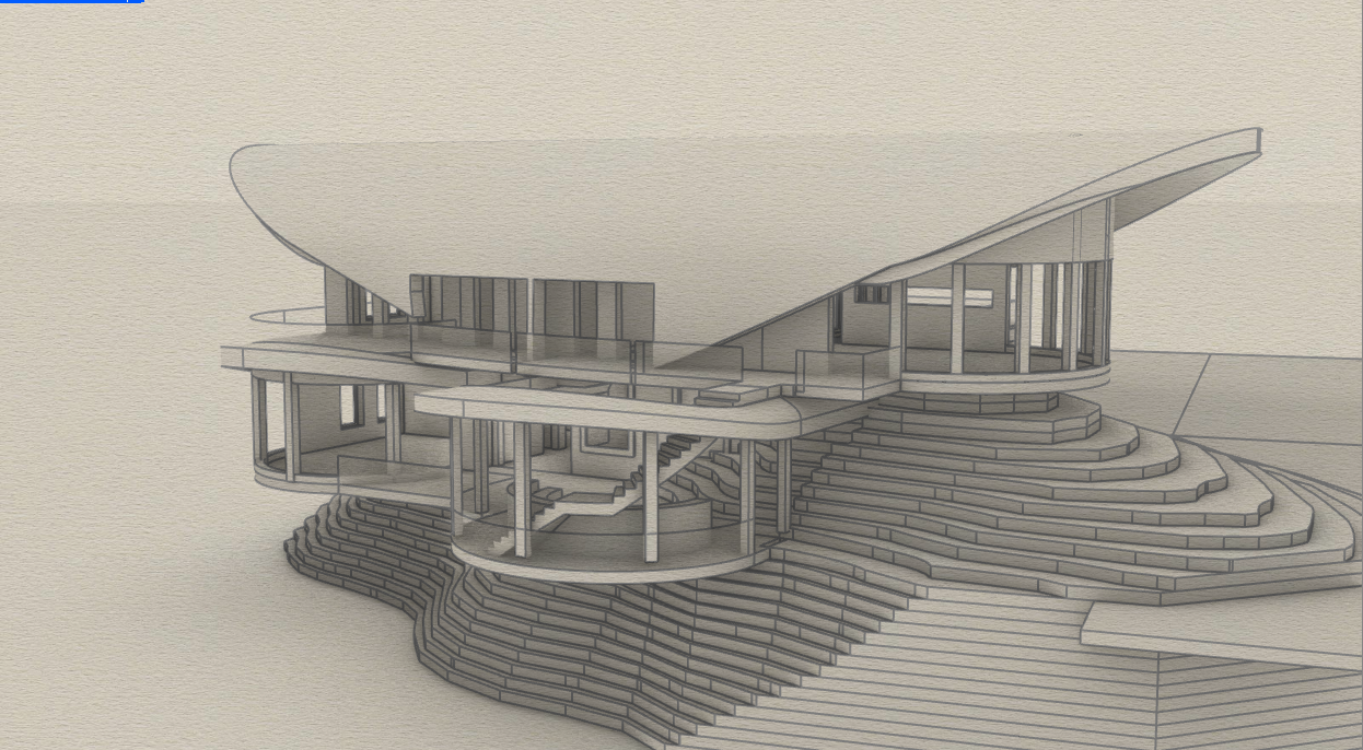 2 story research facility perched off a cliff sitting at a high elevation background filled with cloudy blue sky and mountains fog beneath it black corrugated metal roof gray metal panel walls floor to ceiling glass framed with black steel warm light coming from the inside outdoor deck with amphitheater and curved roof above it railings along the balconies and deck