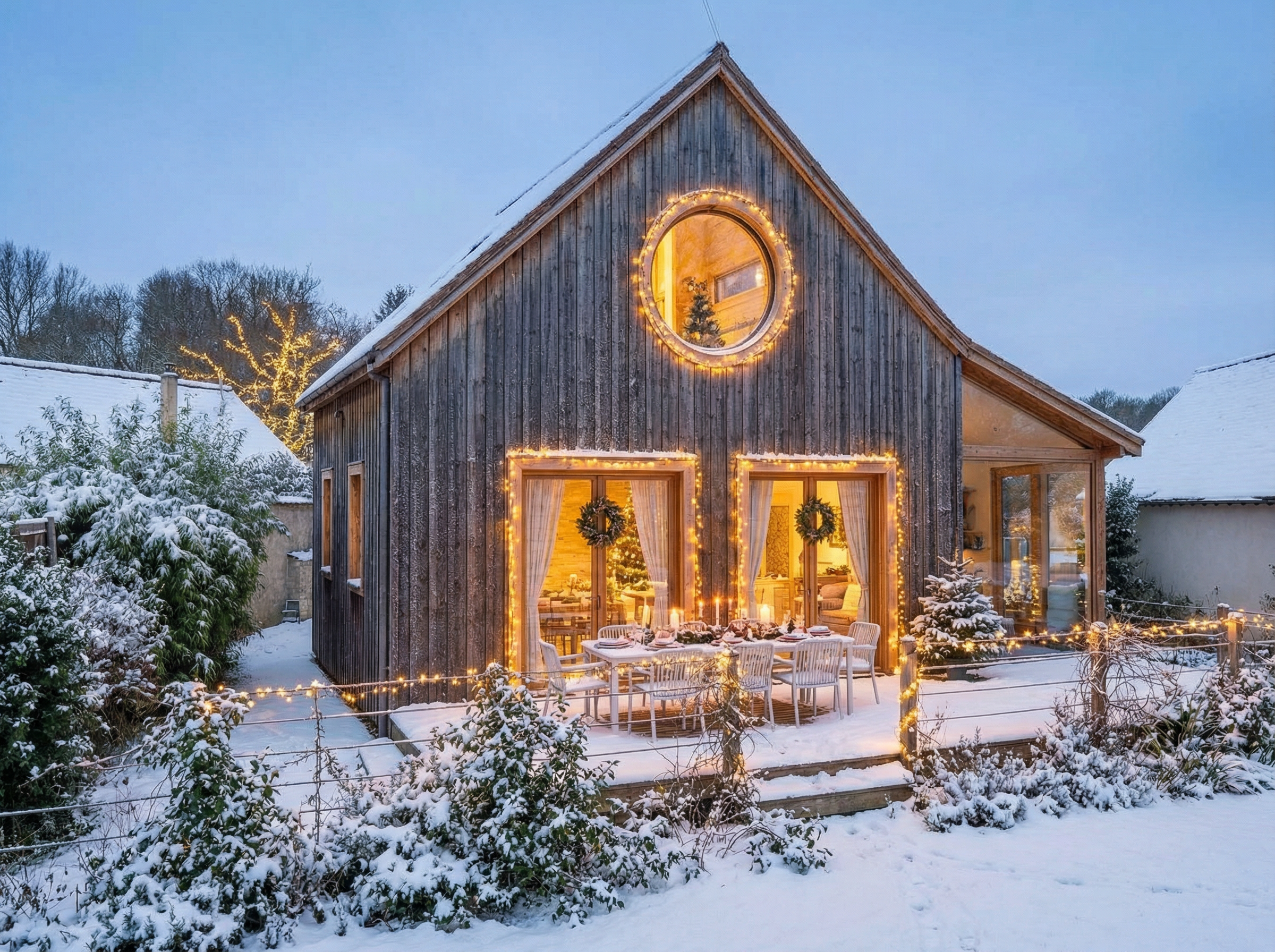 retain the structural elements of the home add green grass landscape through the windows blue sky few small trees far away