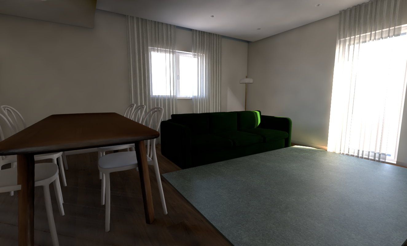 make a super faihful render from the image remove the wgite things on the floor under the table the flor is darker wood the carpet is darker mate green make a night ambient