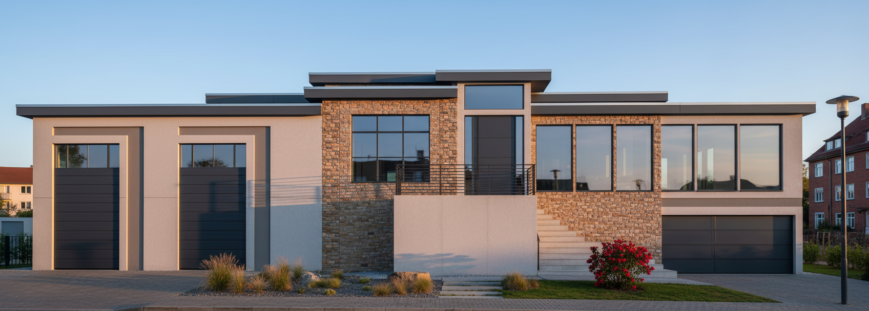 modern exterior shot modern gate on right side modern finishes landscaping white stone architecture