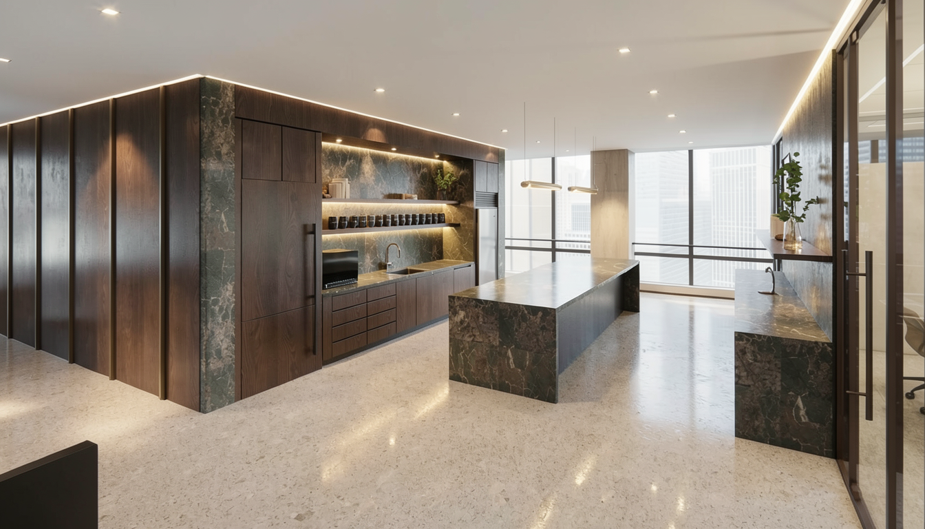 provide a photorealistic rendering keep all the elements proportions and materials as they are provide north daylight through the glass only