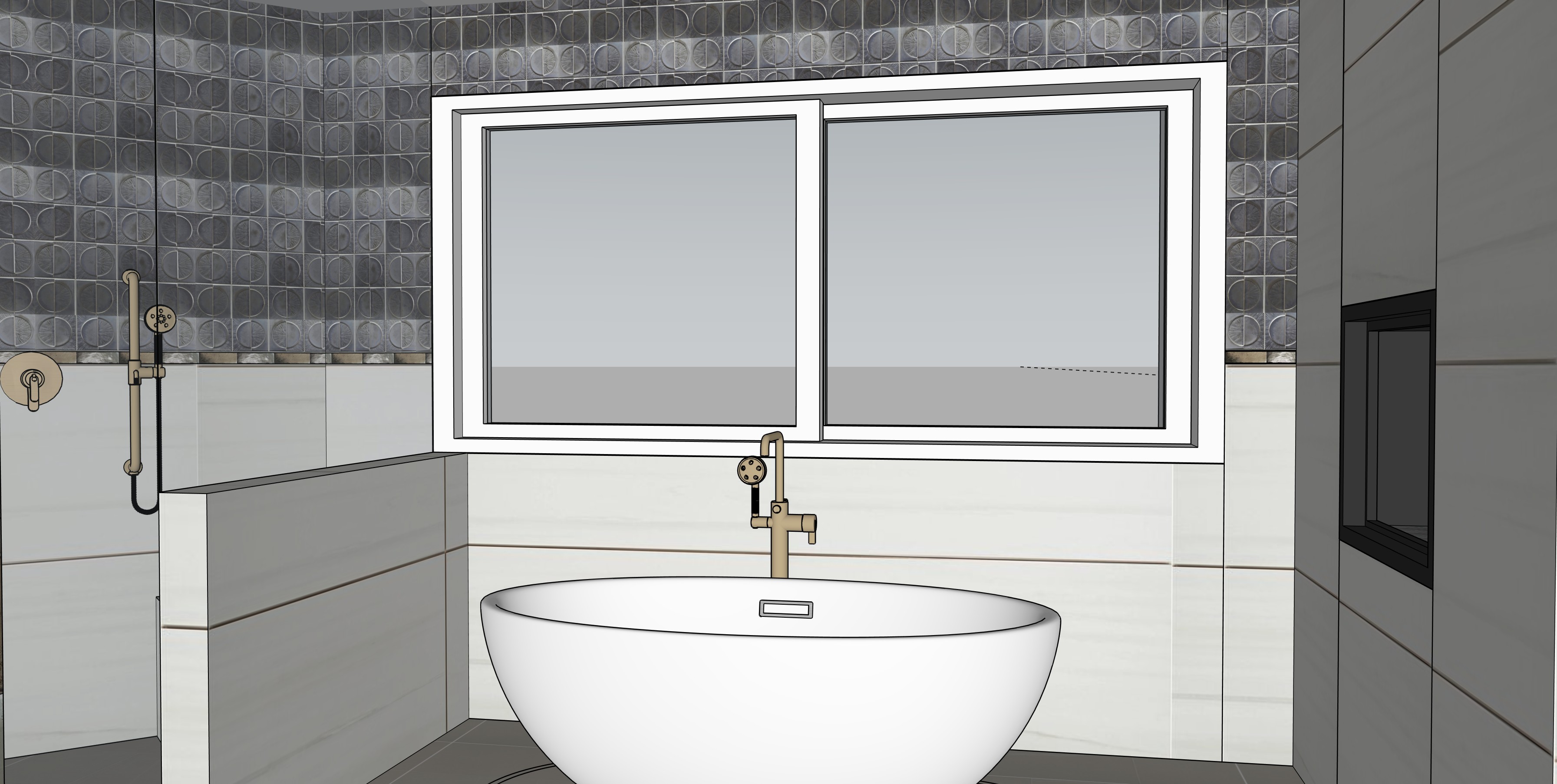 bronze tiles on walls shimmers marble tiles on lower half of walls with soft subtle warm veining polished brass plumbing fixtures which includes shower handles and tub filler window with view of arizona desert