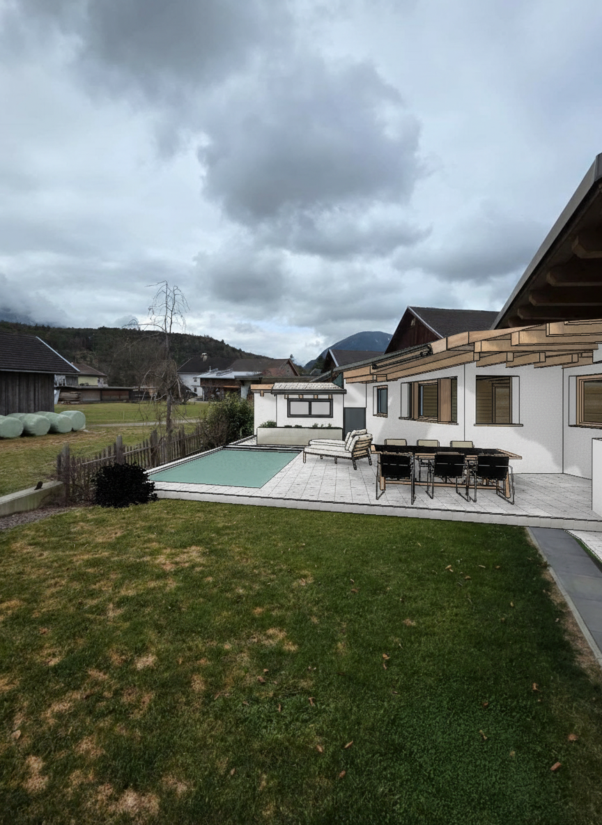 erstelle mir ein fotorealistisches bild ndere die stimmung und den himmel auf ein sonniges sommerwetter bitte belasse alles ident entferne nur den zaun hinter der mauer