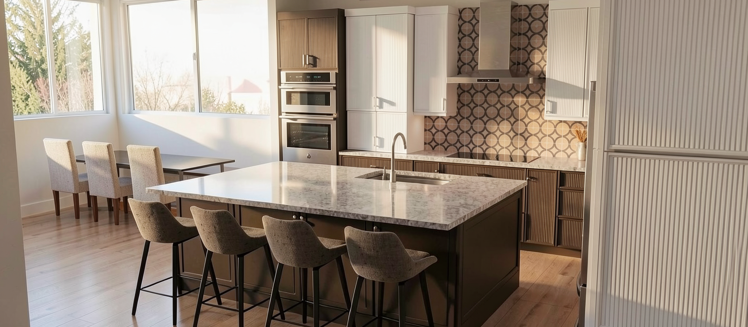master prompt elevation real interior photograph copy paste exactly as written transform the provided elevation into a hyper realistic interior photograph that is indistinguishable from a real professionally shot interior design photograph this must read as a real space captured by a camera not a rendering not a visualization not architectural cg not concept art and not an illustration geometry lock non negotiable preserve the exact original geometry layout proportions ceiling details wall depths panel divisions openings doors cabinetry locations millwork dimensions built ins and circulation paths with zero architectural changes nothing may move scale simplify or be reinterpreted geometry must remain absolutely unchanged camera derivation critical derive the camera position height angle and framing strictly from the uploaded elevation eye level interior photography centered or naturally balanced composition 24 35mm interior lens feel no dramatic angles no stylized framing do not reuse or approximate camera framing from any previous image remove all drawing artifacts completely remove all linework cad edges drafting outlines diagrammatic shapes sketch artifacts nothing may appear outlined flat schematic or illustrative the elevation must be visually reinterpreted as a finished real interior photograph material realism rules wood if present smooth solid plank material extremely subtle restrained grain matte or soft satin finish only no graphic patterns no decorative striping no visual noise wood must absorb light gently never glossy or sharp fabric upholstery if present soft compression subtle seams gentle shadowing natural fabric texture no flat color blocks stone slabs if present light natural veining soft organic variation low contrast no symmetry no bold or busy patterns stone must feel heavy and grounded walls fine surface texture slight tonal variation never flat paint edge construction realism all edges corners joints and transitions must be softly broken and physically realistic no razor sharp corners no cgi perfect edges slight construction tolerances only everything must read as fabricated installed and dimensional lighting photographic behavior lighting must behave like real high end interior photography natural daylight only unless otherwise specified realistic light bounce gentle shadow falloff uneven exposure distribution subtle brightness variation across surfaces avoid studio lighting uniform illumination over clean exposure global illumination look slight softness is preferred over sharpness camera image imperfections very important introduce subtle photographic characteristics gentle lens softness micro exposure variation natural contrast roll off mild atmospheric depth primary plane sharp background slightly softer the image must feel captured not generated absolute constraints no creative interpretation no stylization no exaggeration no added or removed elements any deviation from the original elevation geometry or intent is unacceptable negative prompt always include architectural rendering 3d visualization cgi unreal engine octane vray sketchup look flat textures graphic lines outlined edges over sharpened studio lighting concept art illustration ai look plastic materials glossy wood high contrast grain perfect symmetry add strip led lighting around the parameter of the ceiling design as it shown in uimage keep gray cabinets as white paint and wood as wood rift oak
