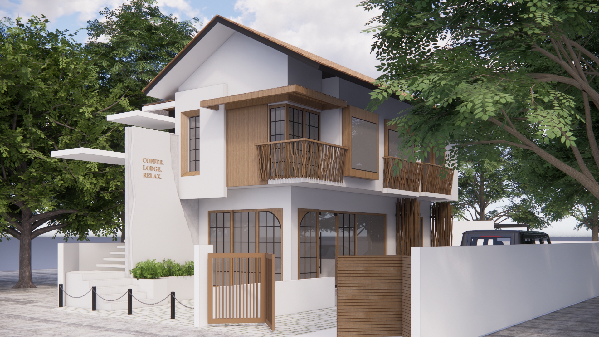 render a modern two story house set amid lush greenery the exterior walls are a crisp white with sleek wooden accents in a warm soft oak tone large windows with dark frames reflect a serene clear blue sky the entrance features minimalist concrete steps with a small vibrant green garden tall trees with rich green leaves surround the house creating a harmonious atmosphere the setting is calm with soft natural lighting enhancing the peaceful ambiance a modern black suv is subtly visible behind a white boundary wall for a touch of sophistication create a hdri photorealistic rendering do not change any image details do not move or modify features keep the colors the same make the rendering photo realistic with 4k resolution