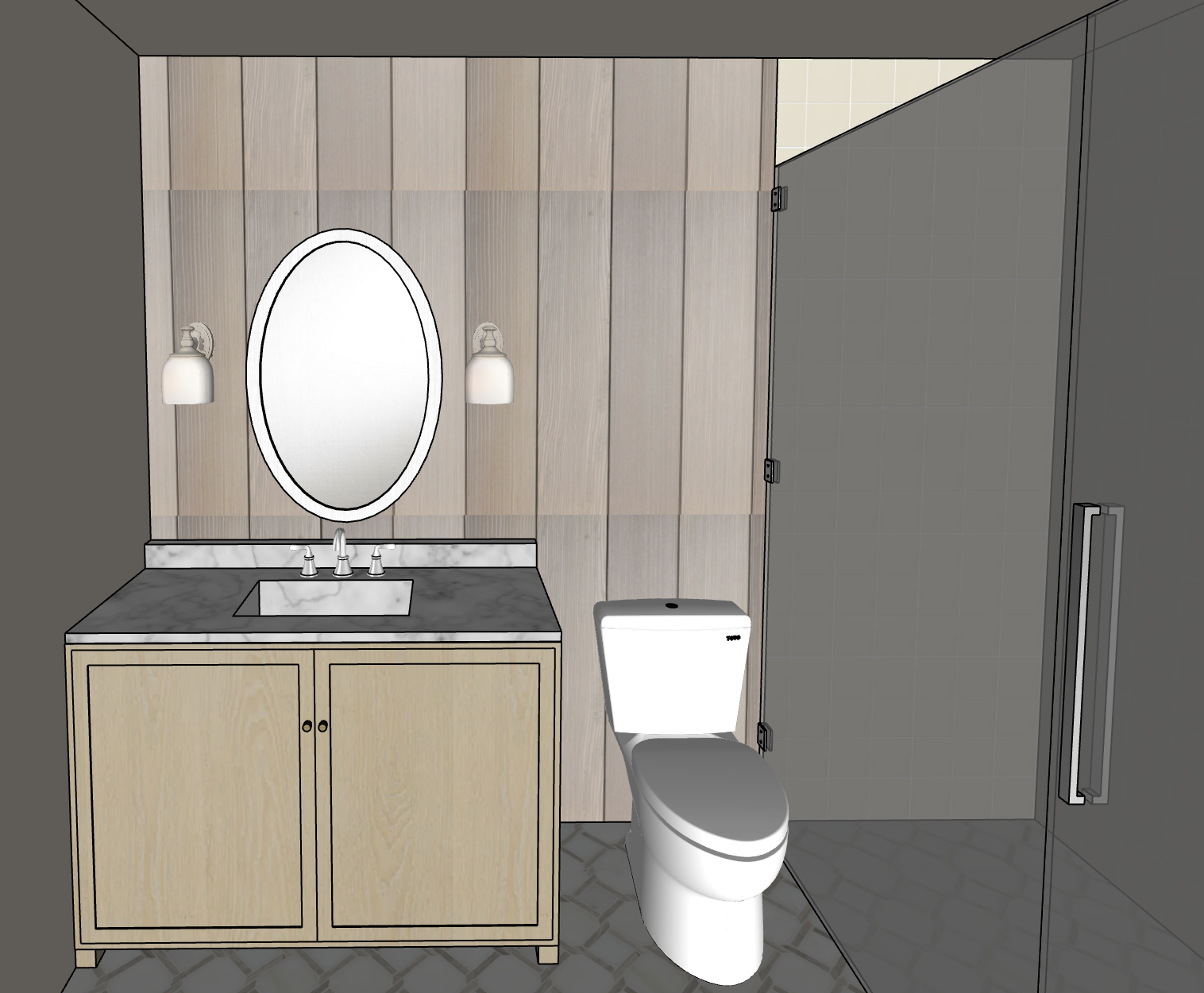make this look like a drawing make only the shower walls look more beige square tile than white