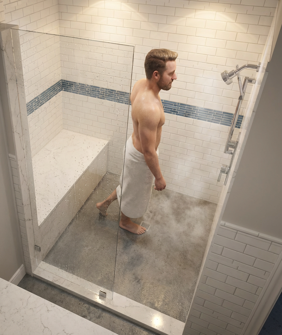 walk in shower with white quartz shower bench and white quartz shower curb the walls have white subway tile with a blue accent tile liner that runs horizontal in the center of the walls and a 2x2 solid white mosaic on the shower pan floor