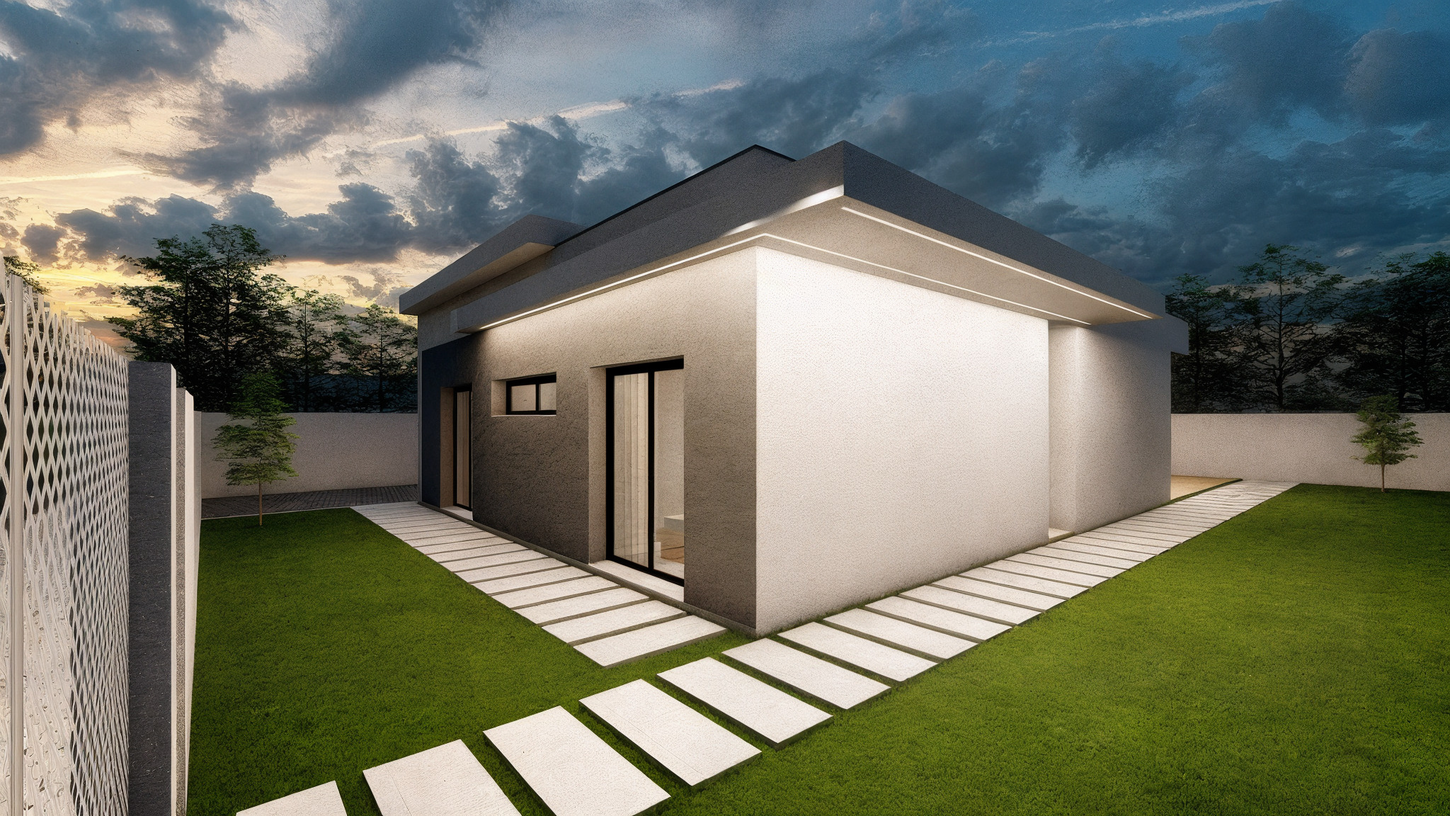 modernist exterior shot the image depicts a modern house with a minimalist design featuring large glass windows a spacious outdoor area with furniture and a well maintained garden with flowers and plants the house has a contemporary clean aesthetic with light colored walls and a wooden deck architecture