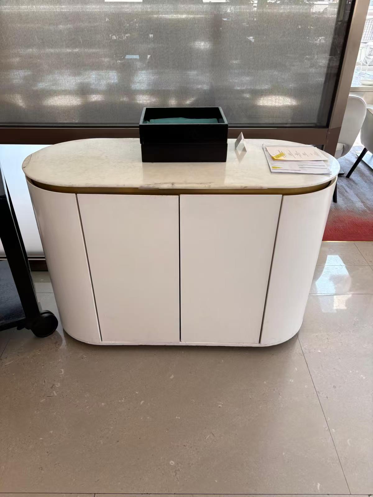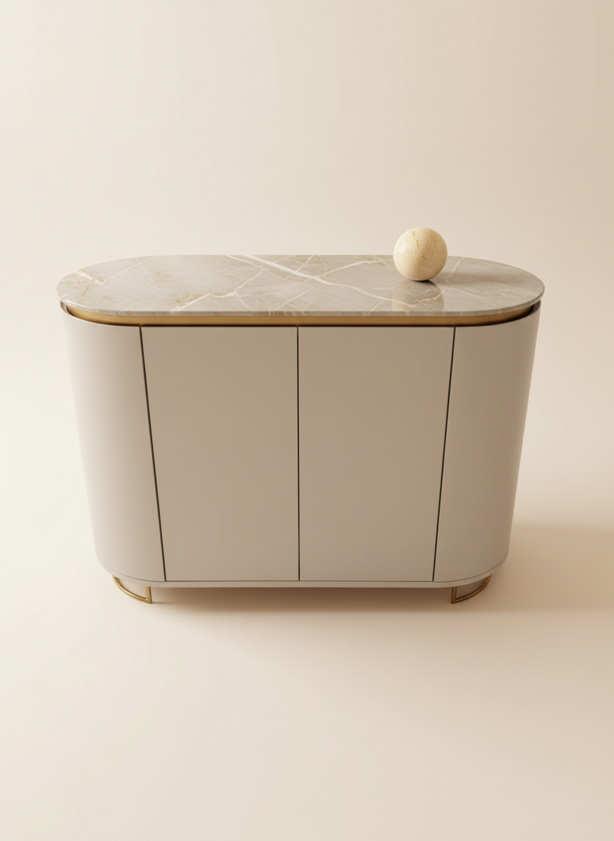 photorealistic image of an upgraded luxury sideboard cabinet placed in exact same position and location as original photo background pixel perfect preservation identical dark charcoal mesh roller window blind behind exact same warm beige cream floor tiles same glossy reflective floor surface with same light reflections same dark furniture leg and wheel visible on left edge same white chair partially visible on right background same red orange rug corner visible on right same ambient room lighting and shadows same camera height angle and focal length same depth perspective new cabinet design completely new but same category brand new luxury sideboard cabinet design same general footprint and position on floor same approximate width and height proportions cabinet body soft warm greige premium lacquer body slightly taller and more refined proportions three panel door front with subtle brass inlay dividers perfectly flush invisible push latch doors ultra thin precision door gap lines fully rounded front corners softer organic form plinth base in matching greige finish flawless mirror smooth matte satin surface marble top generous overhanging light warm gray marble slab stone character grigio carnico marble style soft silver gray base with warm cream undertone elegant flowing white and pale gold veining 5mm overhang beyond cabinet body on all sides satin polished finish with subtle sheen perfectly rounded edge profile brass details refined brushed warm brass edge trim precise 5mm inlay strip at marble cabinet junction three subtle vertical brass inlay lines on door panels matching brass tone throughout warm not yellow hand finished craftsmanship quality cabinet base ultra thin brushed brass hairpin feet four legs slightly elevated 30mm off floor visual lightness and luxury elevation top surface styling completely clear marble surface one single luxury decorative object only small sculptural warm travertine stone sphere 80mm placed off center toward right side nothing else on surface reflection on floor subtle cabinet reflection on glossy floor tiles consistent with existing floor reflections in scene natural integrati