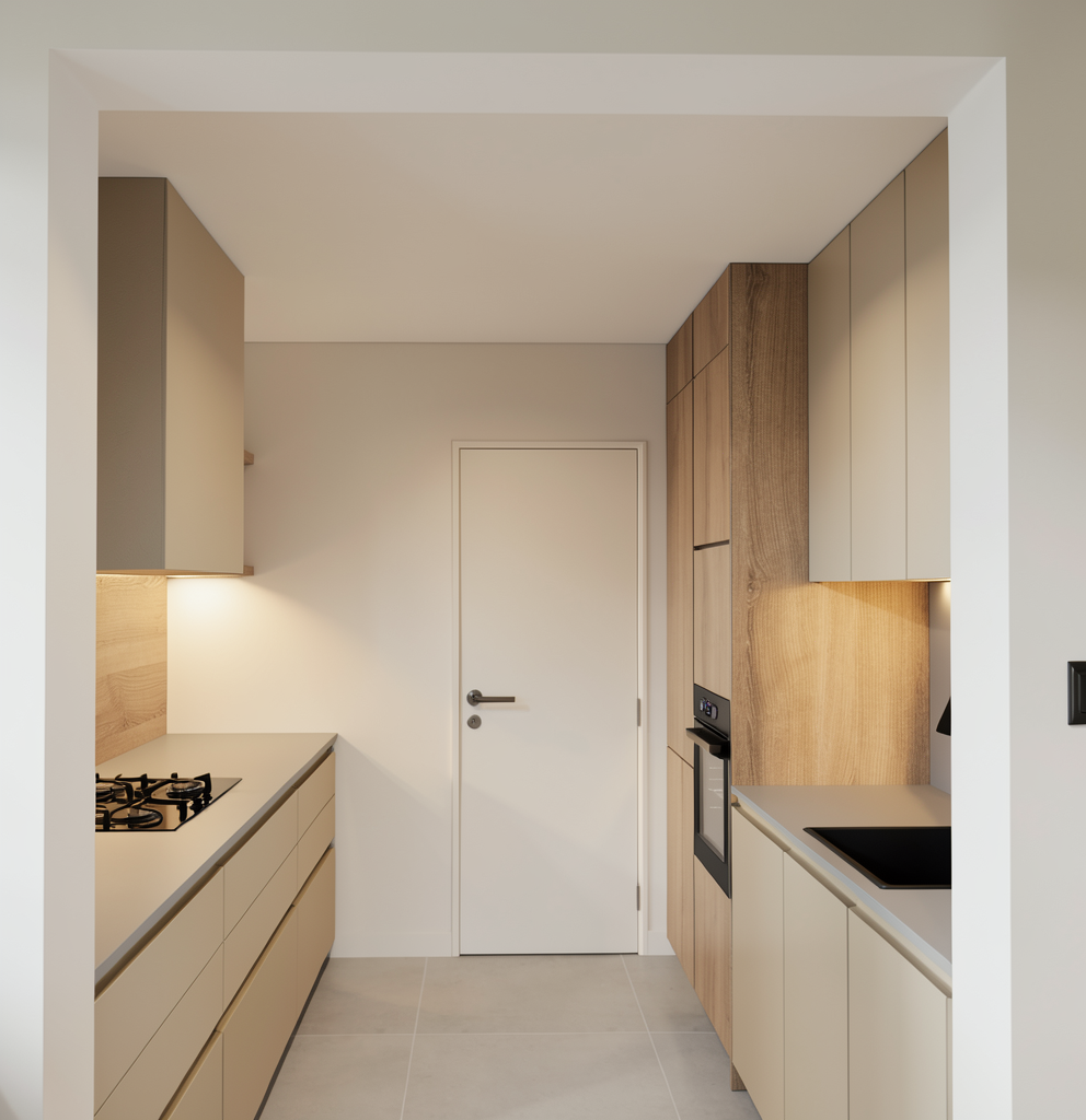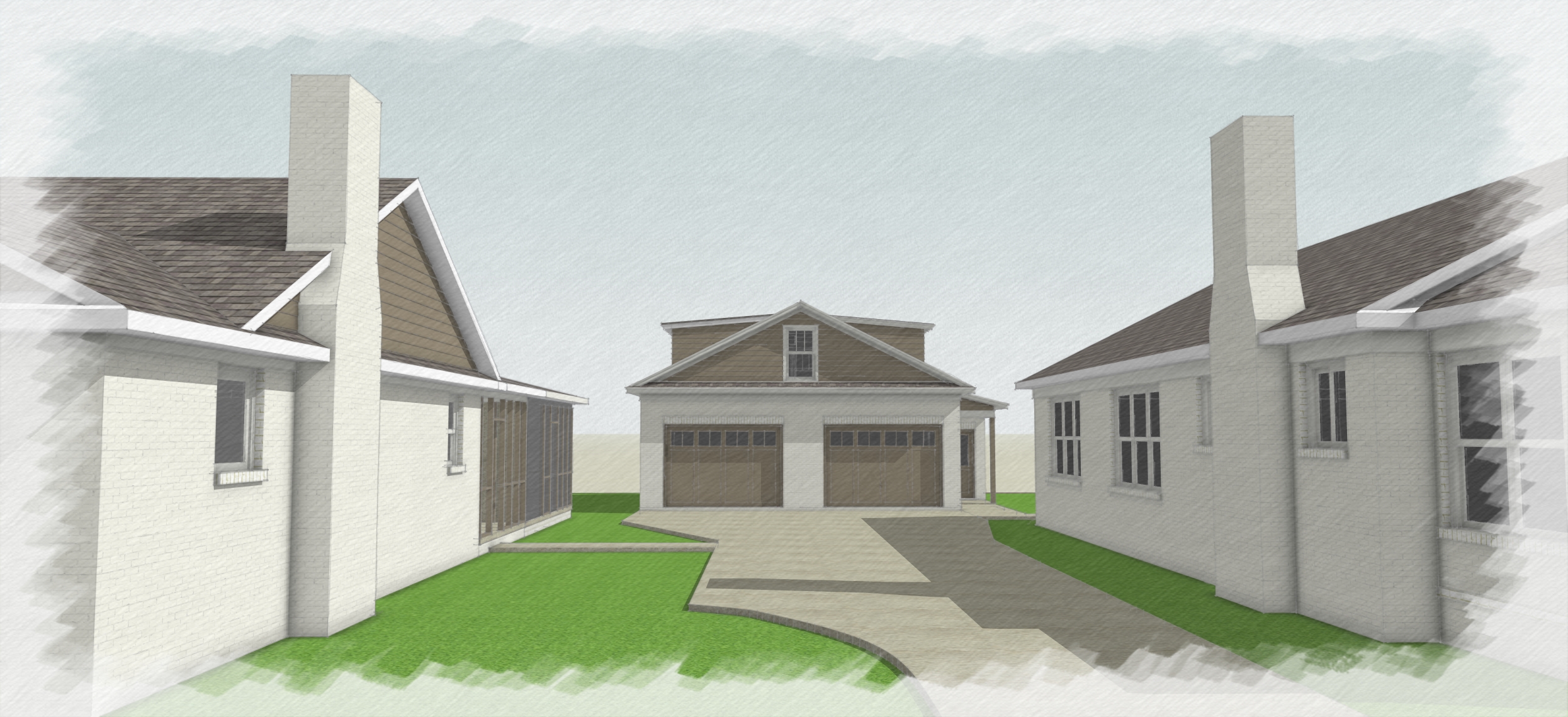 treat the architecture as finalized and not subject to redesign enhance this rendering while preserving all building geometry materials finishes and original color palette do not alter restyle or reinterpret architectural surfaces materials must appear clean and with minimal weathering add suburban landscaping from the southern us it is a wooded lot with oak tree canopy no flowers or overly decorative planting improve lighting sky shadows and atmospheric realism only preserve camera position and composition clean professional architectural visualization style