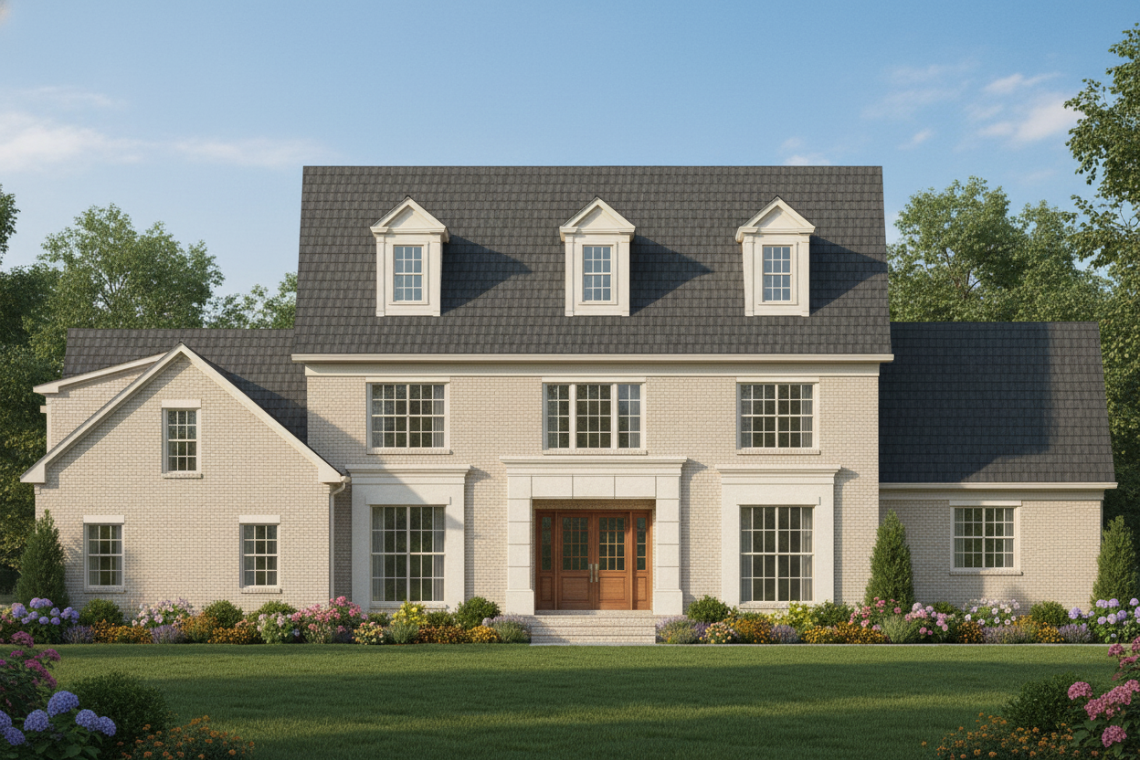 modern two story house featuring a sleek white facade with large glass windows and a wooden accent door surrounding the house a lush green lawn with scattered black and dark green shrubs a few silvery gray trees add a touch of elegance the driveway and pathways are in dark gray stone leading to a small car parked under a minimalist garage the atmosphere is serene and contemporary with soft muted sunlight highlighting the clean lines and textures creating a harmonious inviting vibe