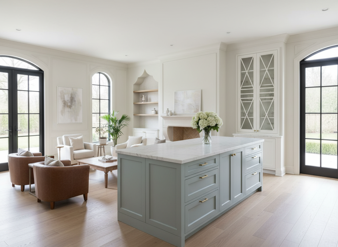 change the wood so that it is a ebony stain and change the fabric on the back two banquettes only to a dark green color in suede fabric keep all the other fabrics as is