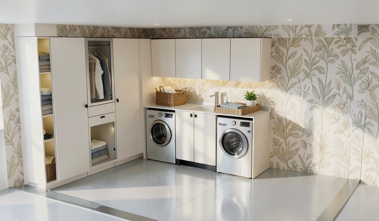 pon decoracion cesta de ropa en la encimera decoracion en la encimera para cuarto de lavado quitar toda decoracion pon bandeja de ropa en la habitaci n es un cuarto de lavado cambia suelo a porcelanico color gris suave colocar ropa doblada dentro del mueble vitrina quita la ropa doblada quitar ropa colgada quitar ropa doblada pon una tabla de plancha quitar toda la decoracion