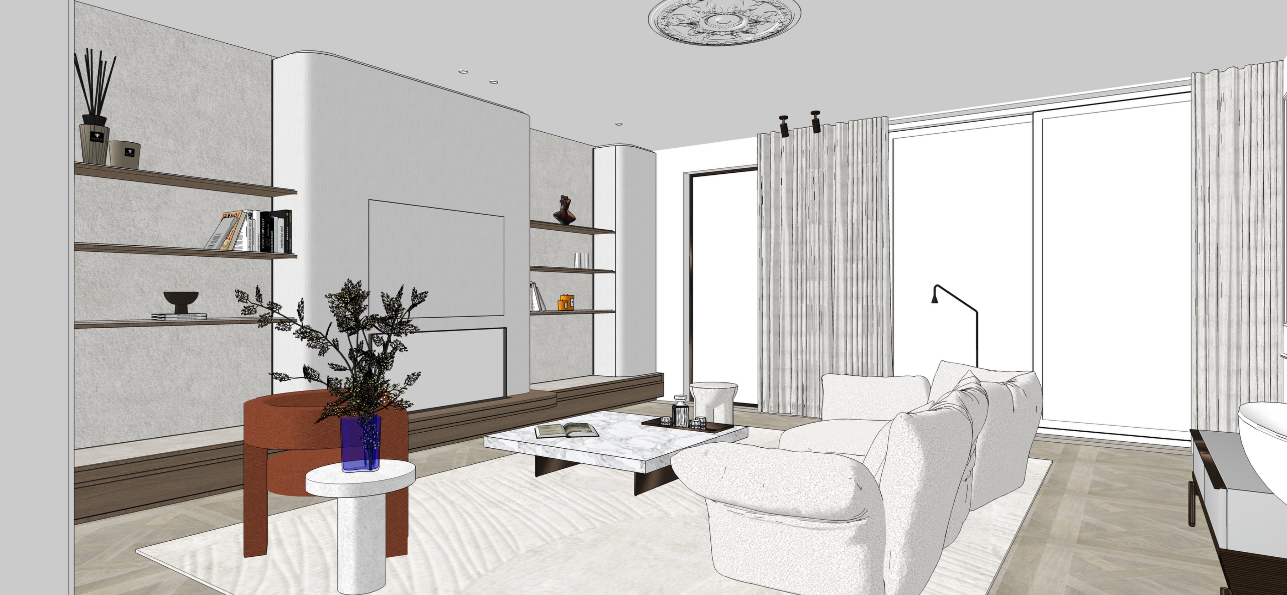 create a photorealistic interior render of a refined living room with a warm high end and calm atmosphere the space features a central burning fireplace finished in light plaster with a concealed tv panel above it that is visually integrated and does not stand out as a screen the built in shelving behind the seating area is finished with light beige suede wall panels and walnut wood shelves and subtle vertical led lighting is integrated in the open niches on both sides of the shelving the floor is finished with light oak versaille parquet and the rug has a sculptural texture with multiple pile heights the coffee table is made of calacatta gold marble and the seating is upholstered in soft light bouclet fabric the glass door with a bronze frame opens towards a white stained oak built in cabinet wall there is an upholstered terracotta colored design chair on the left side that gives the space some warmth and eclectic look the large window gives access to a terrace and overlooks a lush garden of a villa the wood used in the space is walnut with a warm natural tone all interior lighting is warm white at 2700k and creates a soft layered lighting atmosphere daylight enters naturally through the large window without altering the interior design no elements materials lighting fixtures or furniture may be added removed or changed