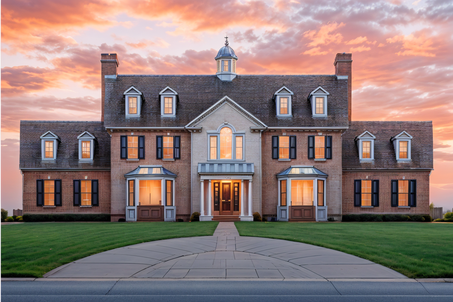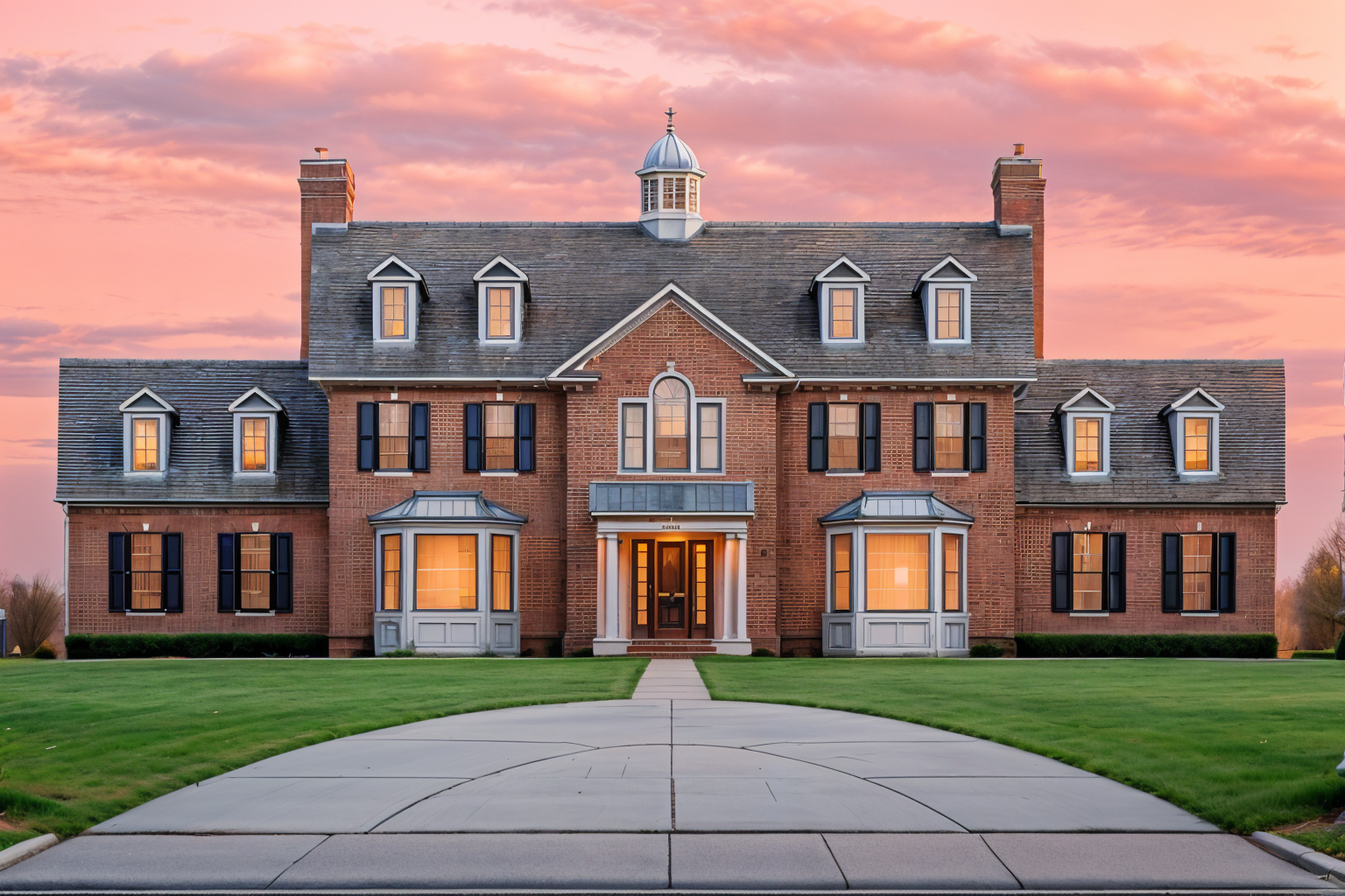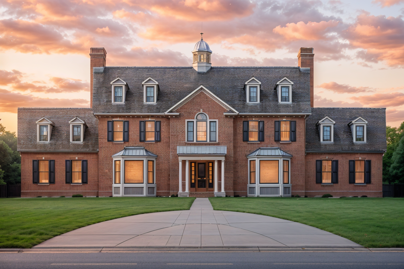 exterior shot exterior photo of a georgian revival style home with white windows red bricks black shutters dark slate for the main house copper roof for the front porch and bay windows and landscaping in front of the house