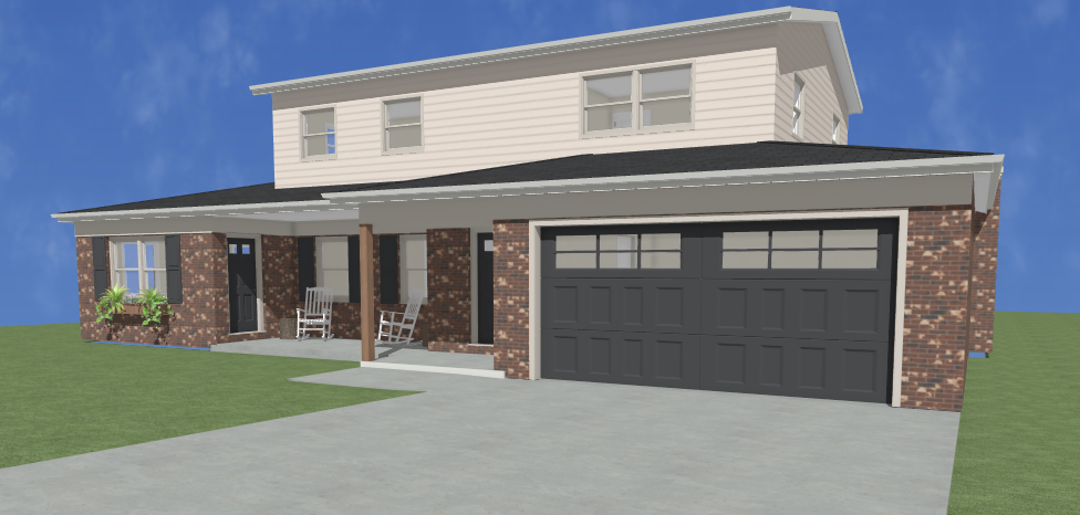 place in a suburban neighborhood with driveway in front and tree line behind