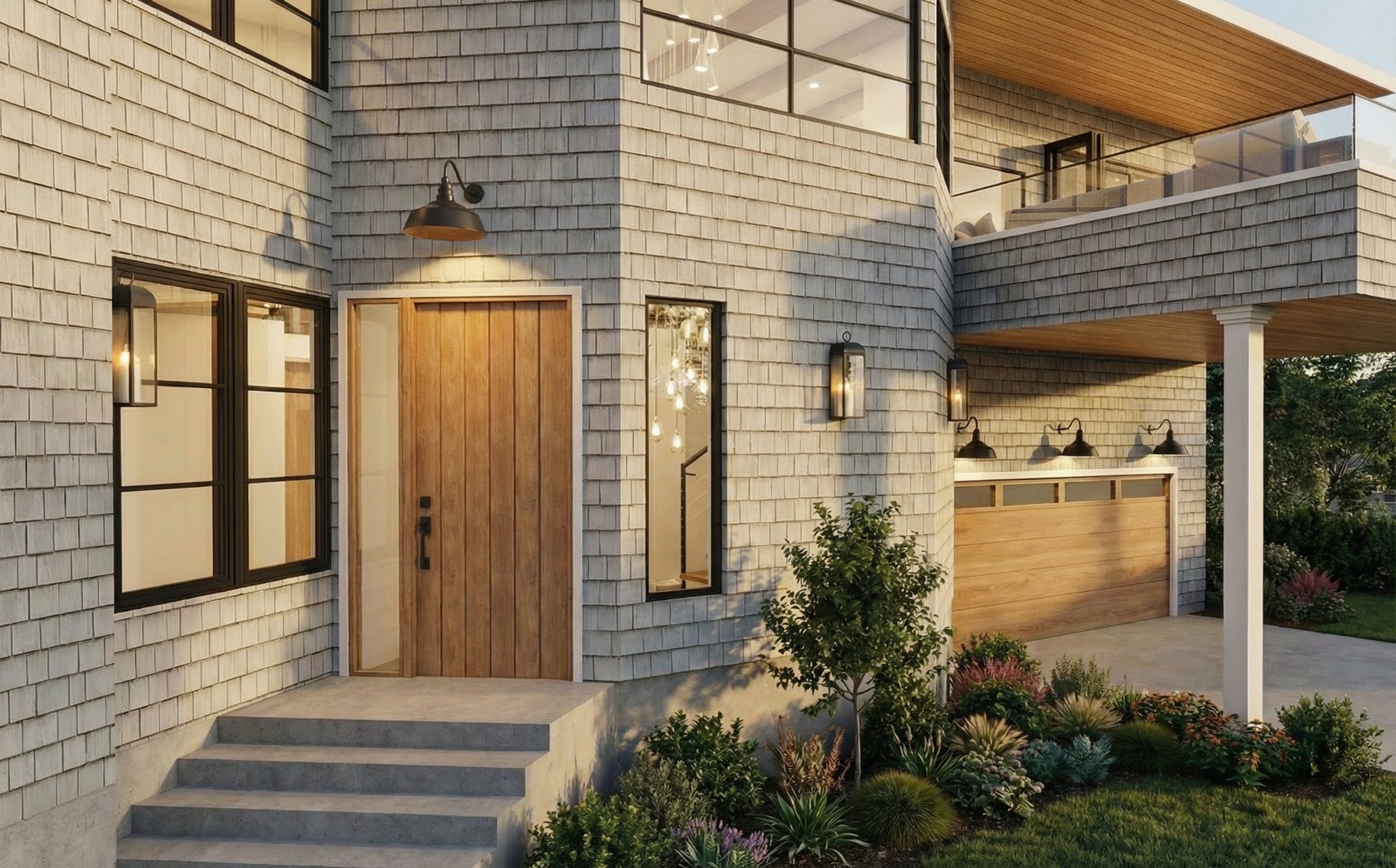 recreate this photorealistic rendering of this exterior keep everything as is keep all lighting landscaping light oak on ceilings and front door remove light over front door