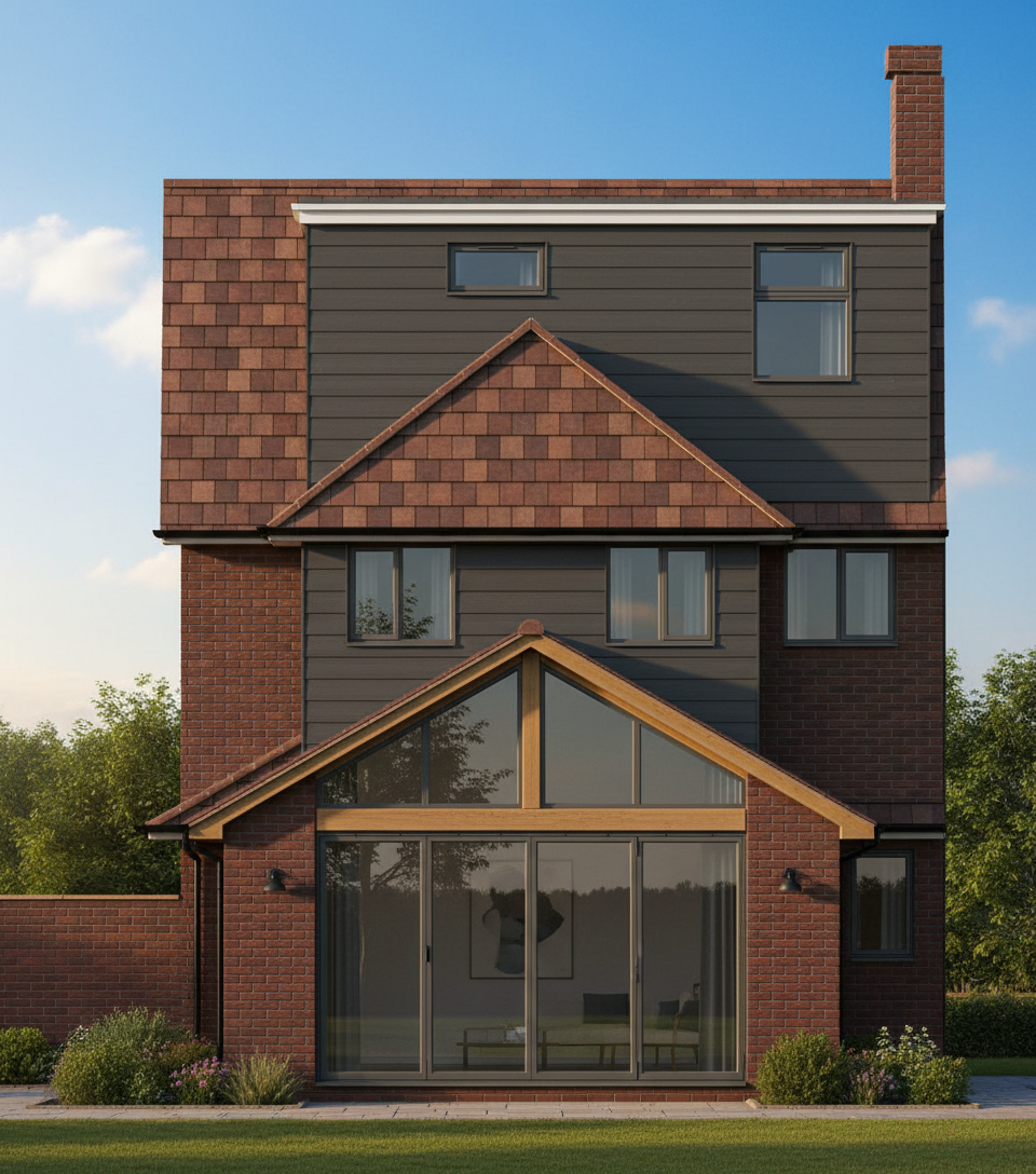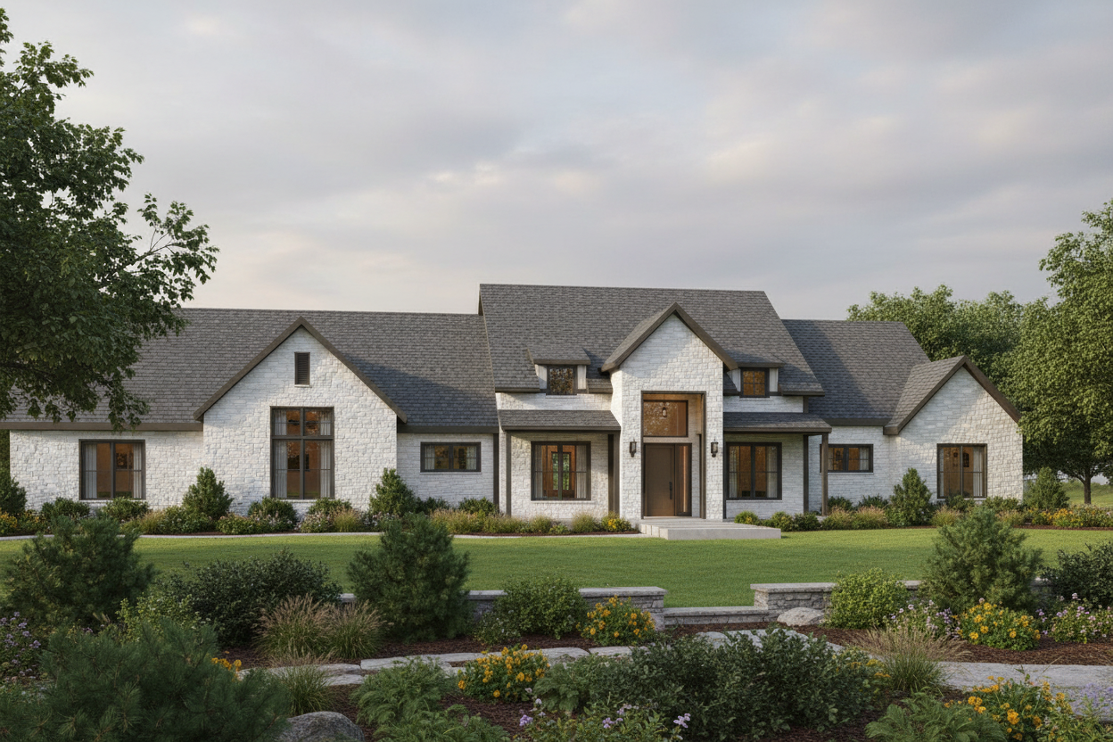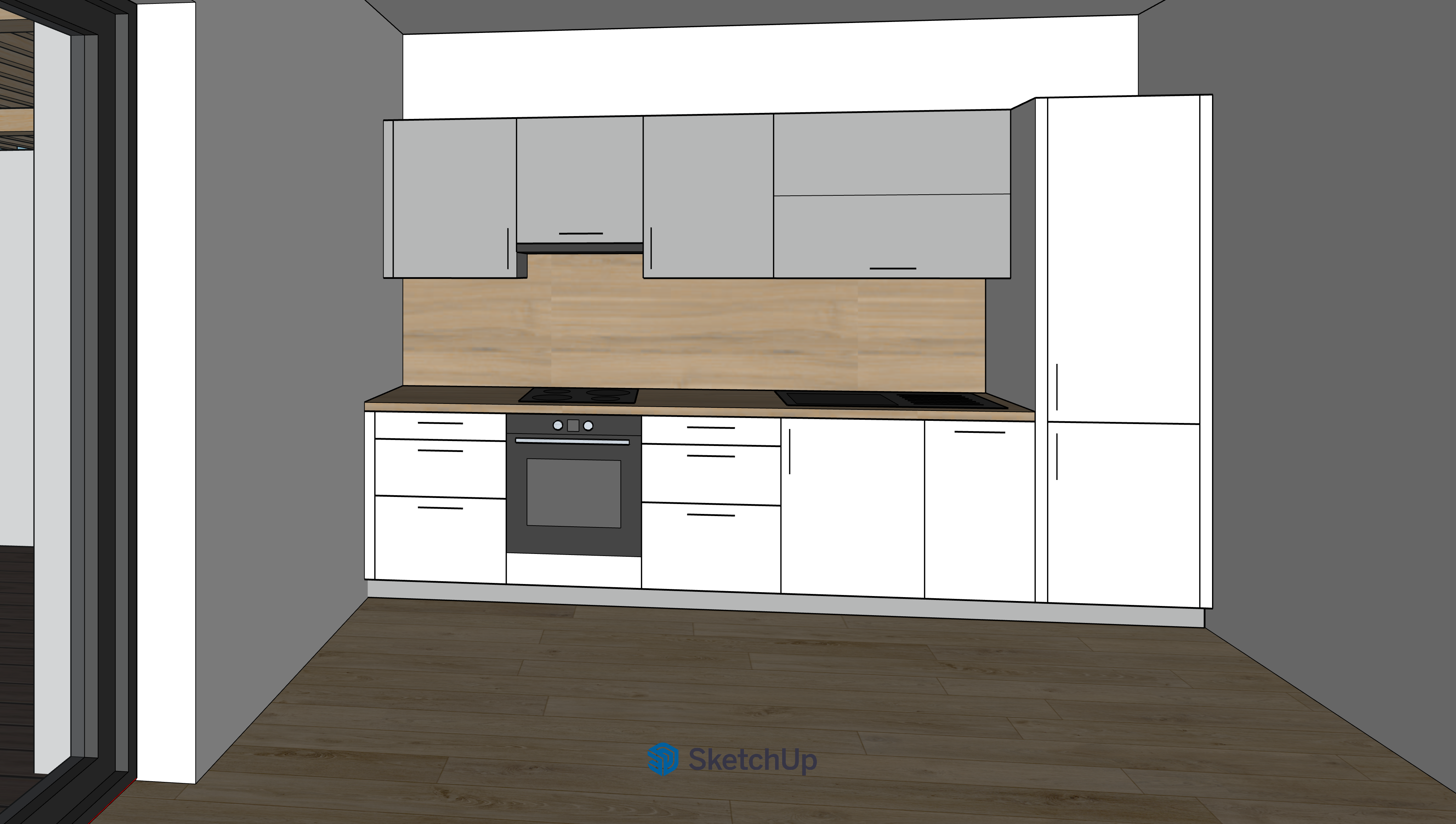 interior shot modern interior design open room and kitchen stylish conference and minimalist furniture light oak with a slight emphasis on the floor slats large glass doors with subtle reflections white walls and ceiling warm ambient lighting soft shadows books on a wooden shelf realistic texture kitchen with white glossy doors on both sides of tall cabinets with a 5 cm wide strip tiling element next to the stove on both sides 3 drawers shallow at the top deep at the bottom the upper cabinets are gray a wide cabinet with a hinged door next to the tall cabinet for the refrigerator far right above the stove there is a cabinet with a strip hood the wall between the upper and lower cabinets is lined with a wooden board in an oak pattern the worktop in the same pattern