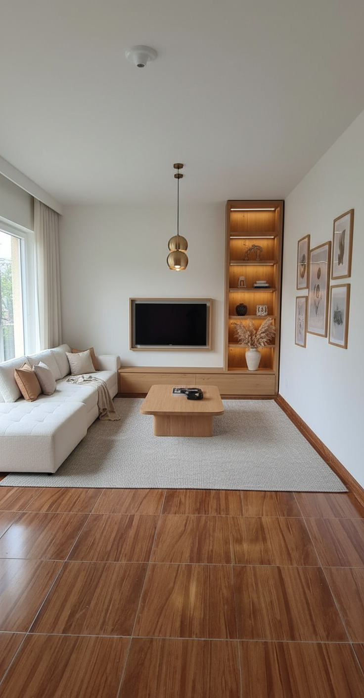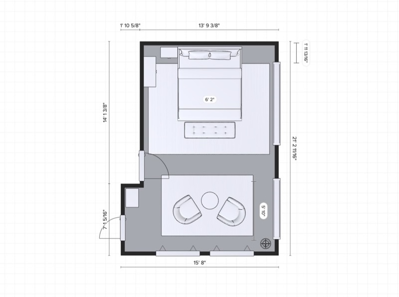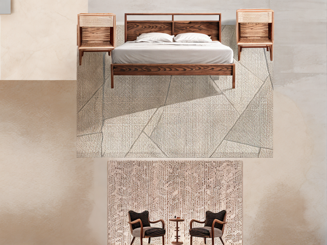 interior shot generate a realistic 3d bedroom render strictly following the attached floor plan and moodboard use the same furniture and materials shown do not replace or modify any item keep the rug bed and chairs identical in color shape and placement match lighting color palette and atmosphere from the moodboard style modern minimal natural tones calm and elegant