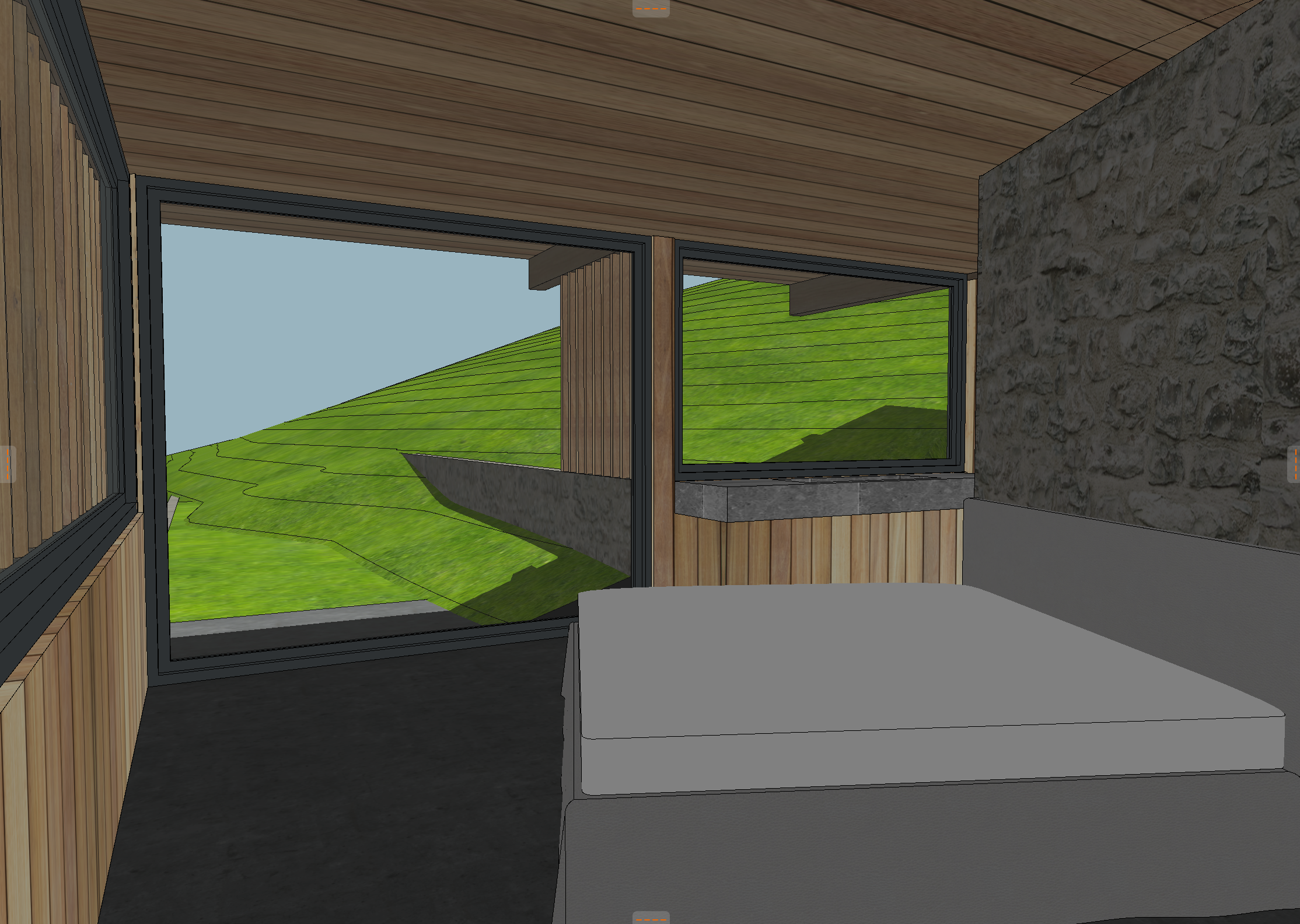 landscape hillside with sagebrush and tall wild grasses brown drystack stone walls sheep skin rug on floor