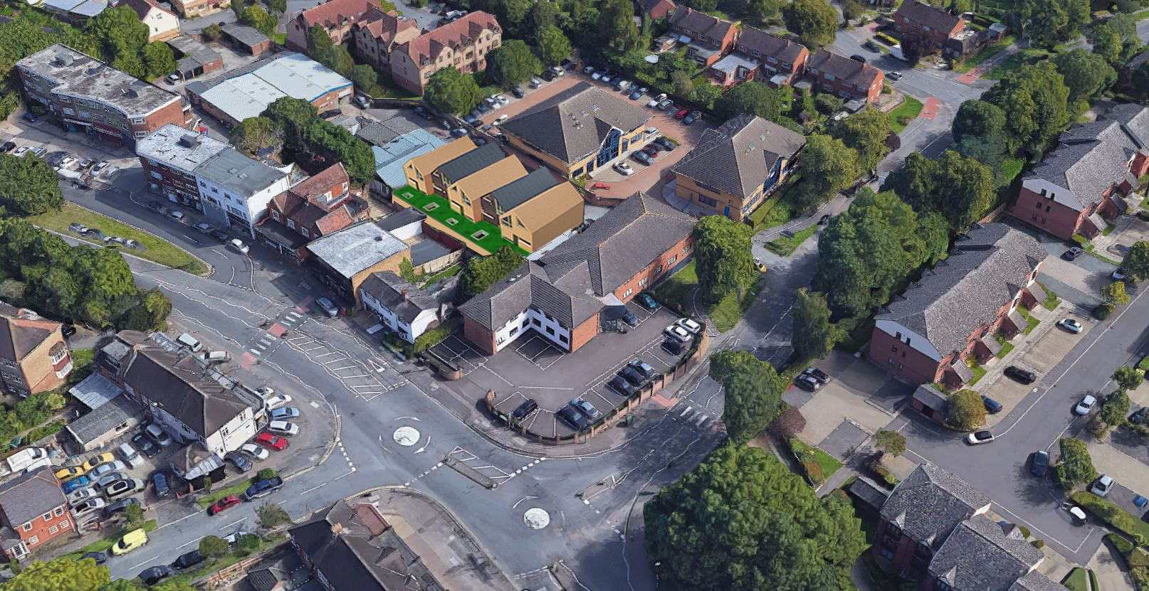 proposed sketch model superimposed in centre of site add realism match shadows and realistic uk morning lighting with grey sky and strong diffuse global lighting the 5 pitched gable roofs in the central proposal scheme alternate between black metal sheet cladding and clay roof tiles the lower flat roof is planted semi intensive roof with flat roof windows