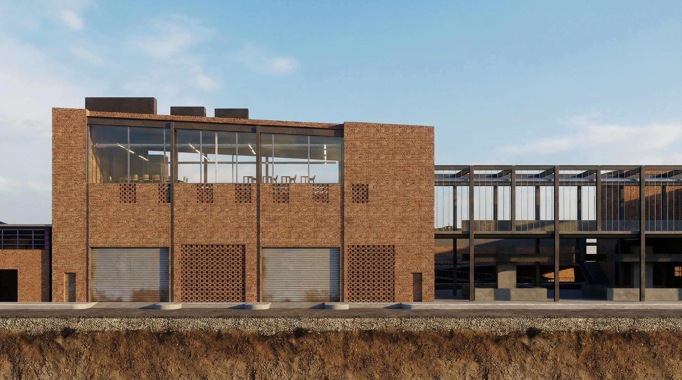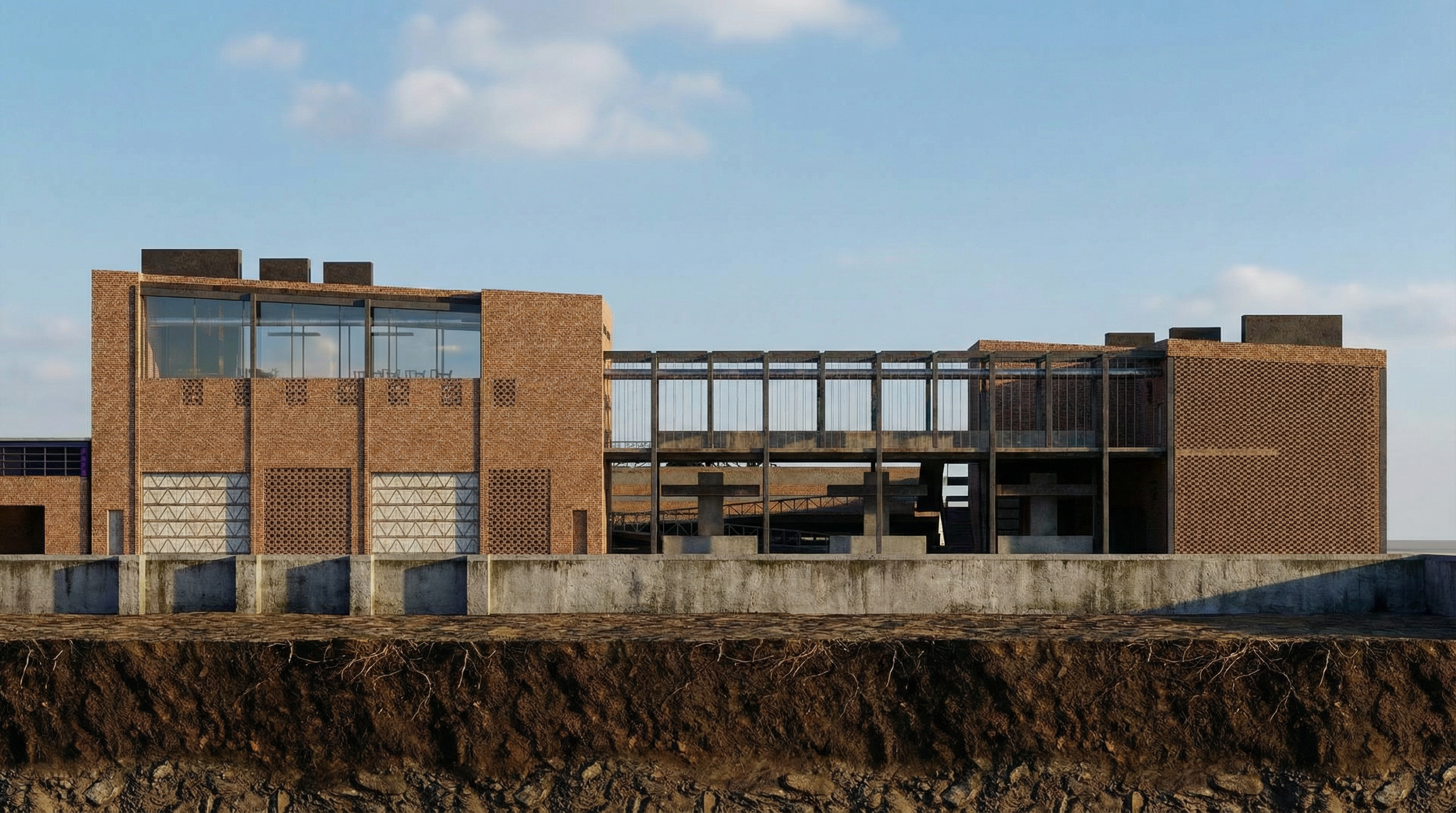 make this elevation look realistic make the ground just ground cut like a normal section cut and take away foundation make sky more real ok do not zoom in though add crops in the concrete planters in middle glass structure on second floor do not change materiality the first floor below the urban farm has steel booths which is where food stalls are