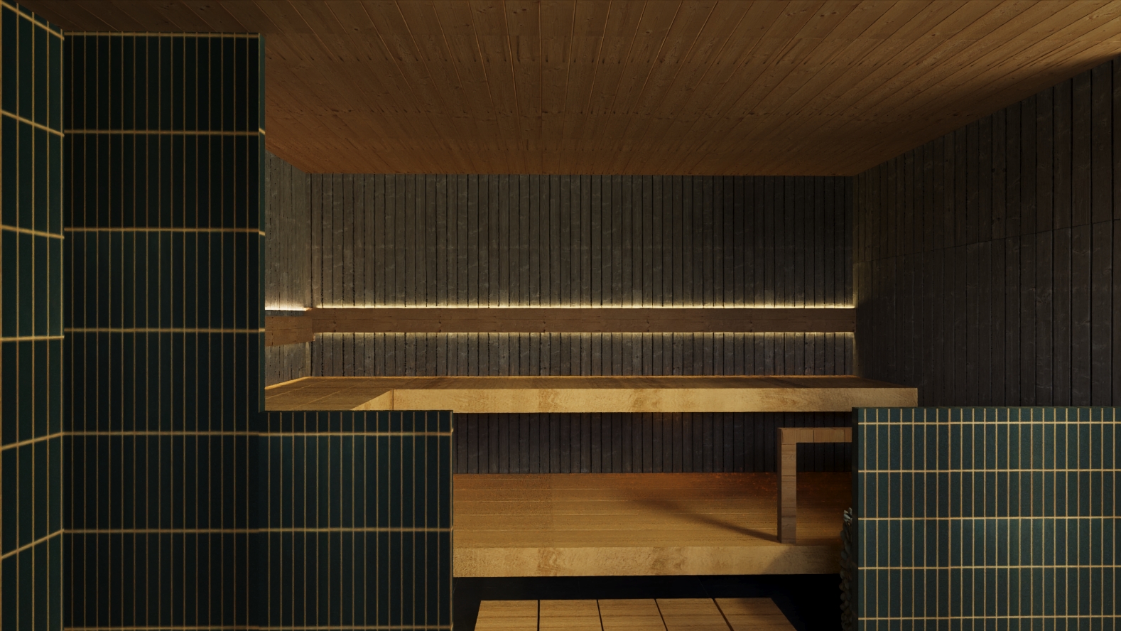create a dramatic view of this sauna with enhanced lighting and quality of materials