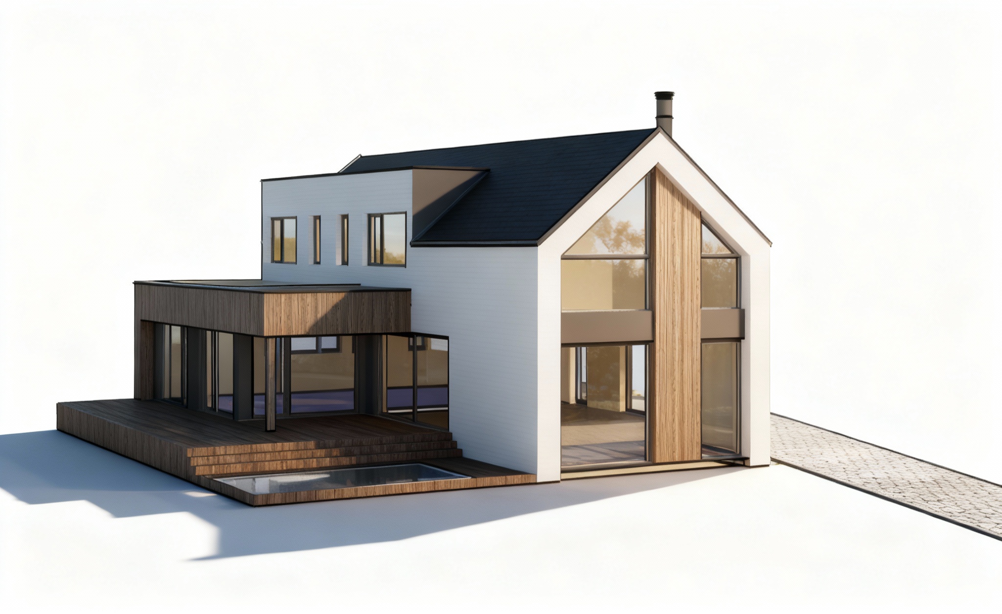 exterior shot render a modernist architectural building with sleek angular lines use a palette of light gray for the concrete deep charcoal for the window frames and reflective glass the building should stand in an urban landscape with a clear blue sky and warm sunlight to create a bright and inviting atmosphere add subtle shadows for depth and dimension highlighting the building s geometric design architecture