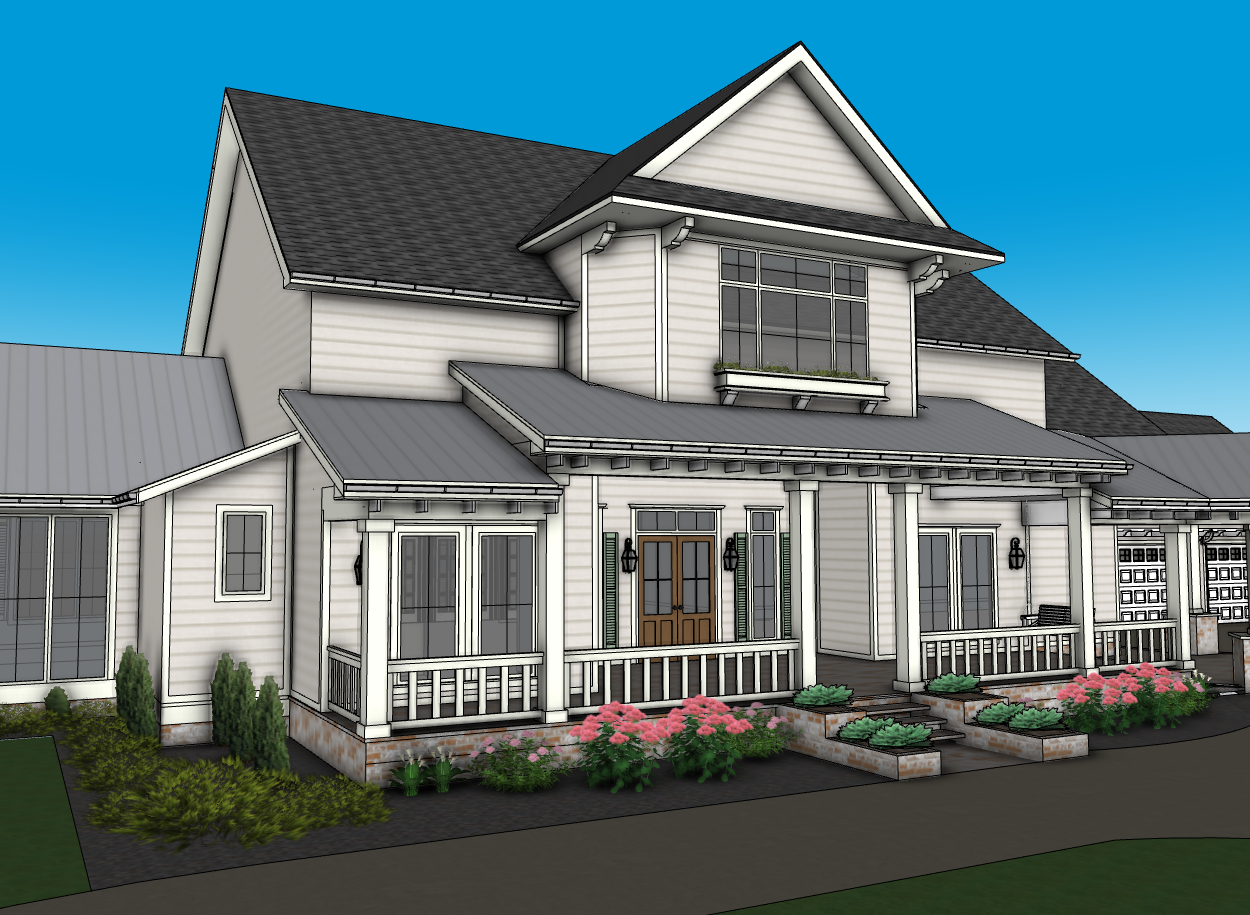 a charming two story southern savannah home with a welcoming porch painted in soft white the roof is a dark slate gray complementing the pristine white exterior lush green shrubs and vibrant pink flowers line the walkway adding a pop of color against the cool gray pathway the windows are adorned with crisp white frames an elaborate bay window dormer sits on top of the metal roof over the porch a bright clear blue sky creates a serene and inviting atmosphere emphasizing the peaceful rural setting
