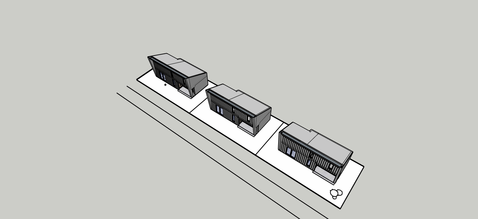 make it professional keep wood and metal sheet as it is put bushers around put forest around do not modify anything at the model keep the model as it is do not put anything extra do not put gutters and downspouts on the roof respect land dimension around each house