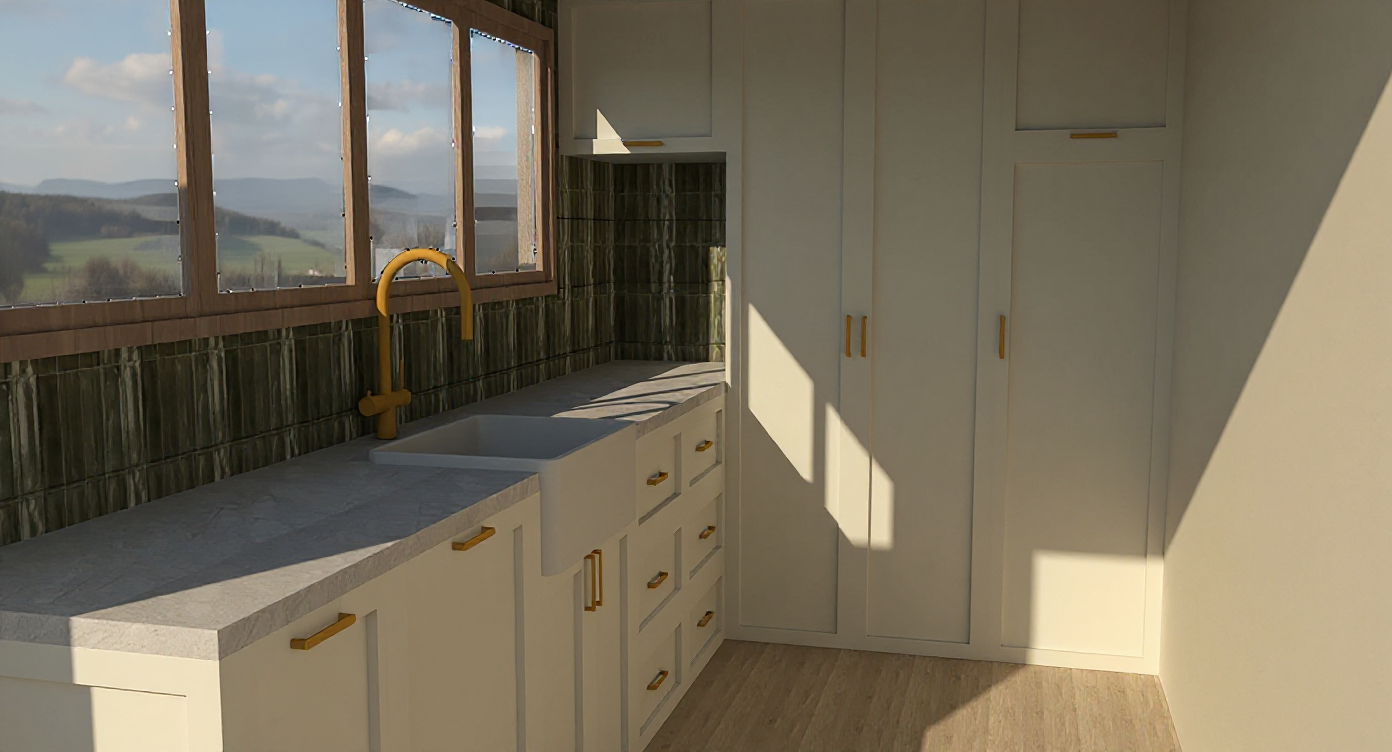 left side is a screened in porch house to have dark shingles navy grey color siding wooded land lake view in distance through trees porch to have wood slates to the ground porch is dark wood